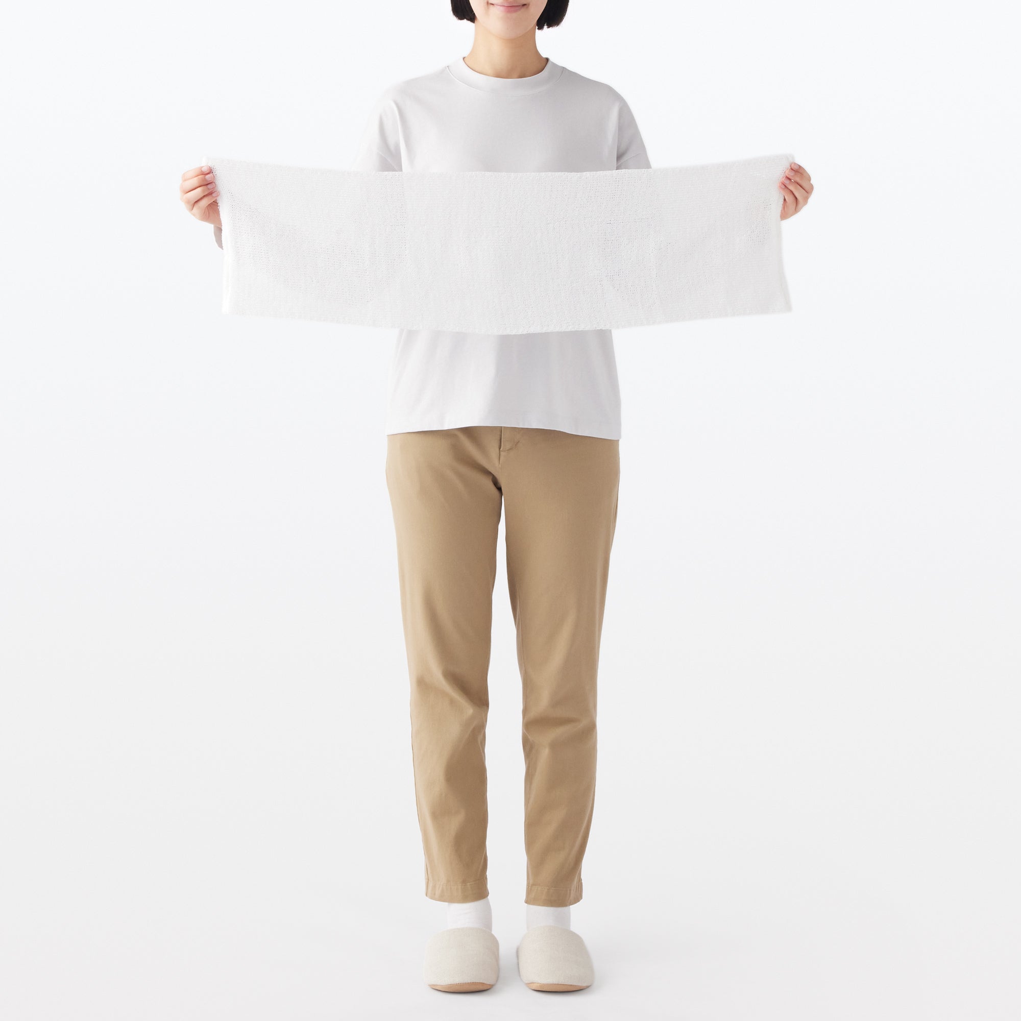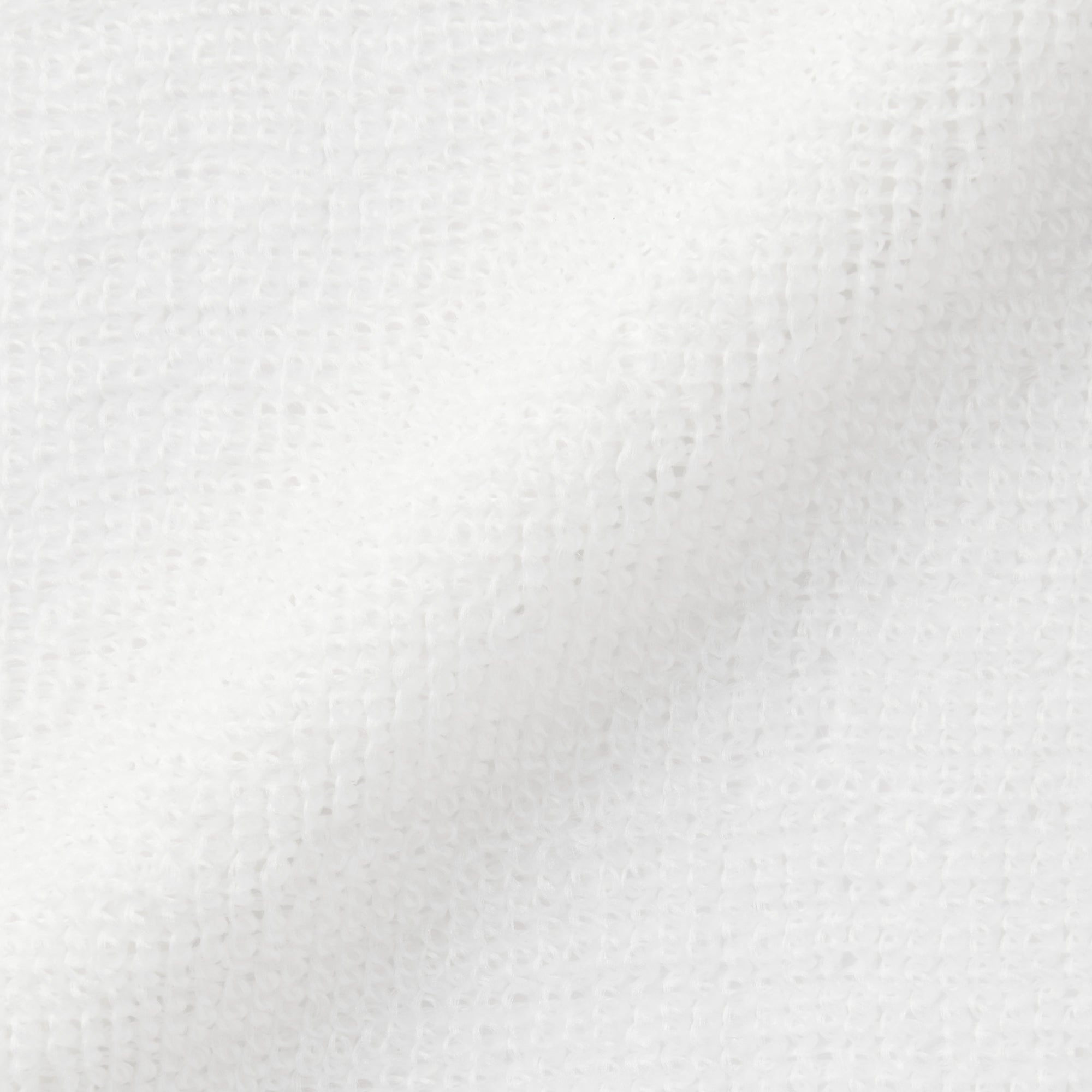 A towel made of a polyester and cotton blend. designed with a three-dimensional mesh pile that can quickly and easily create a lather. The material is soft. stretchy. and gentle on the skin.
