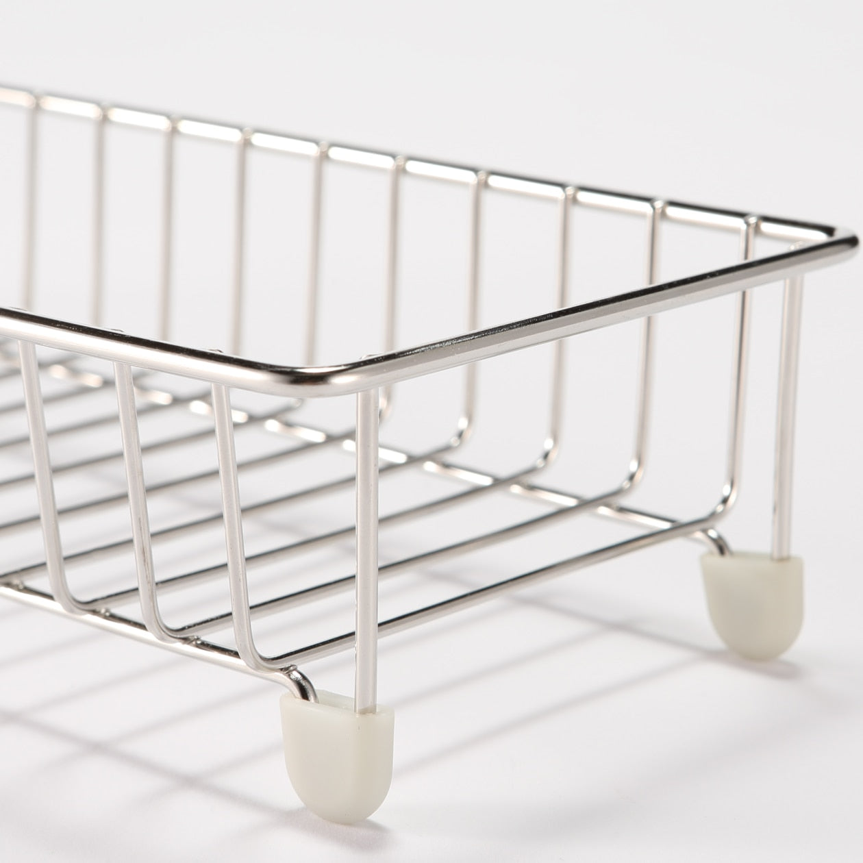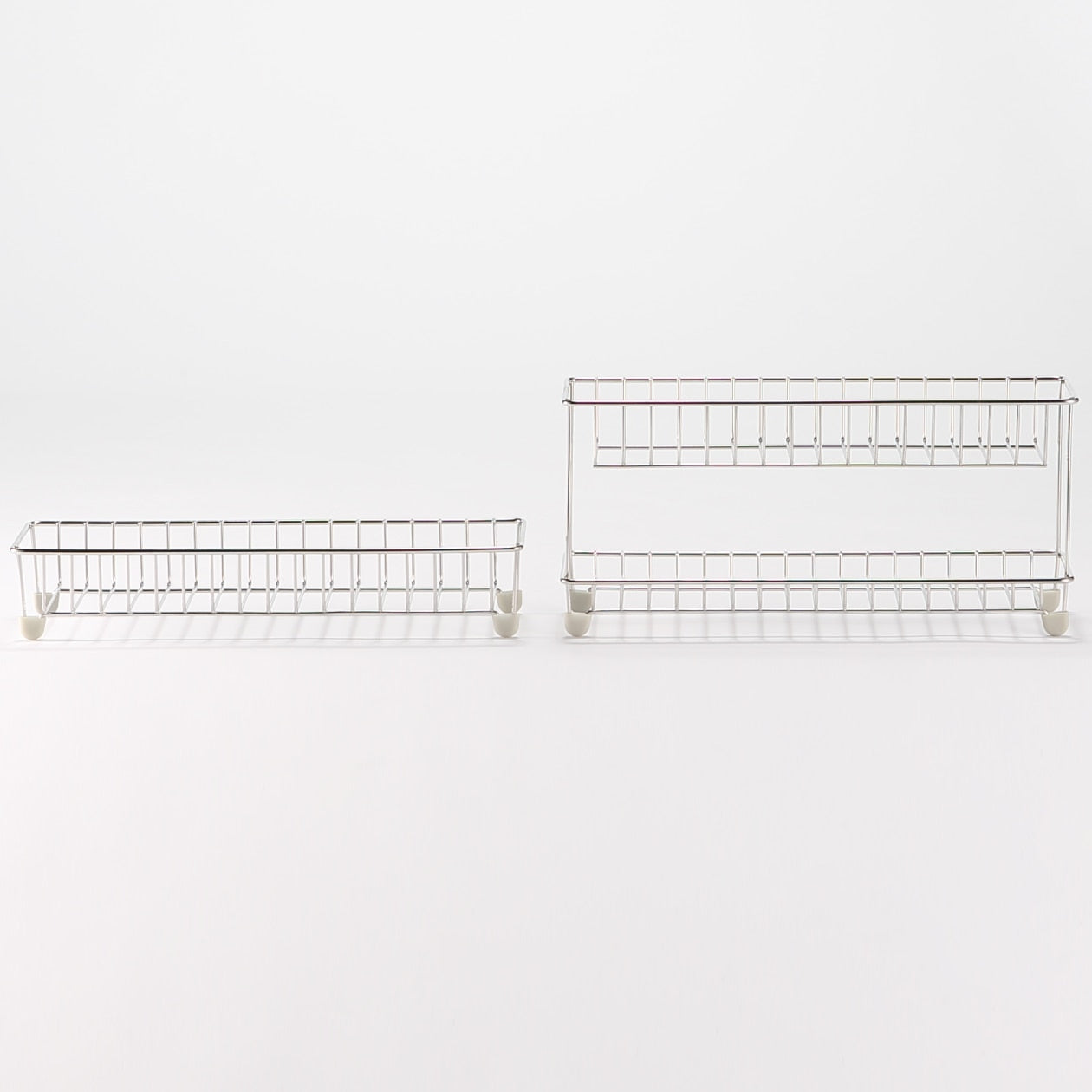 A bathroom bottle rack made of durable steel. It is the perfect size for 4 MUJI PET Refill bottles.