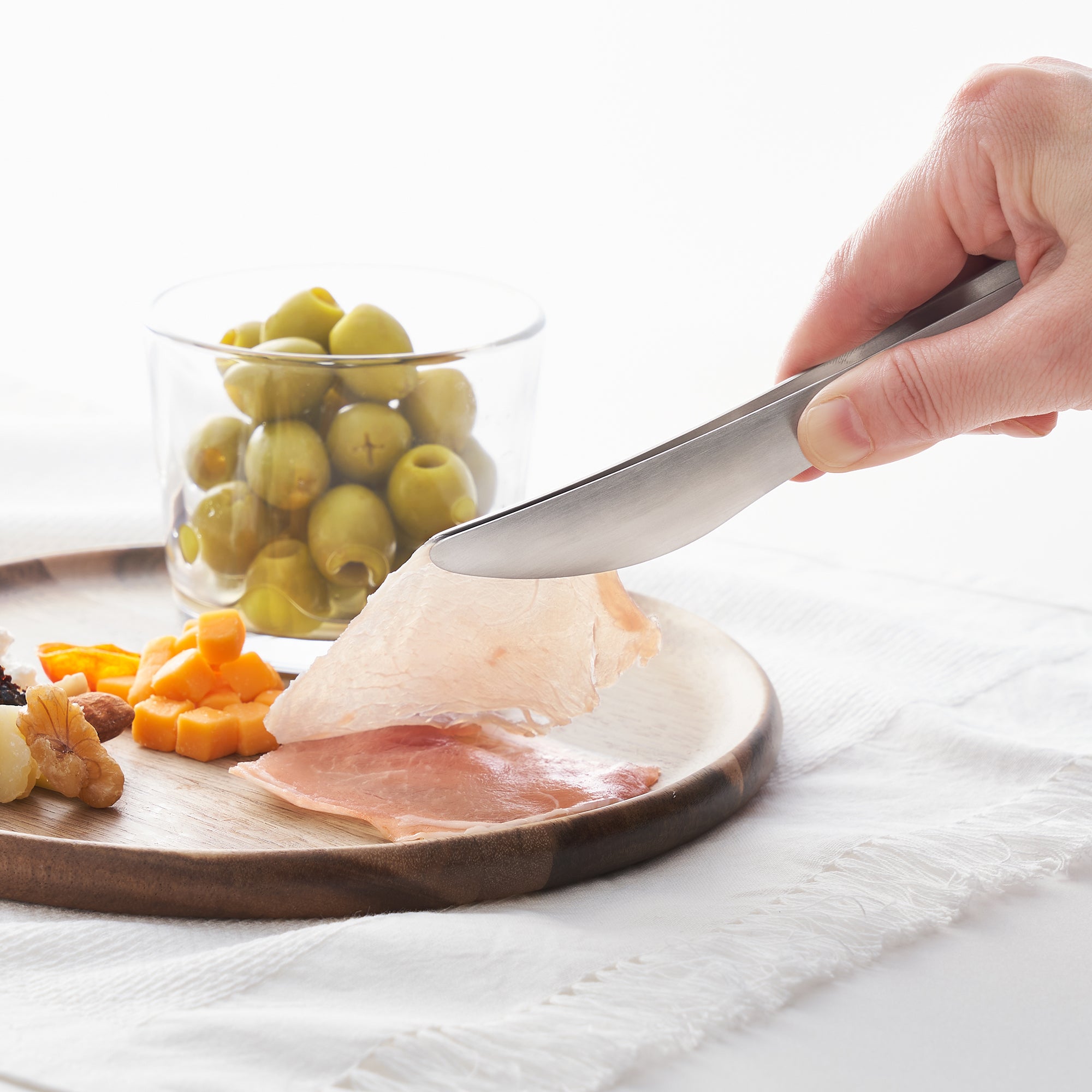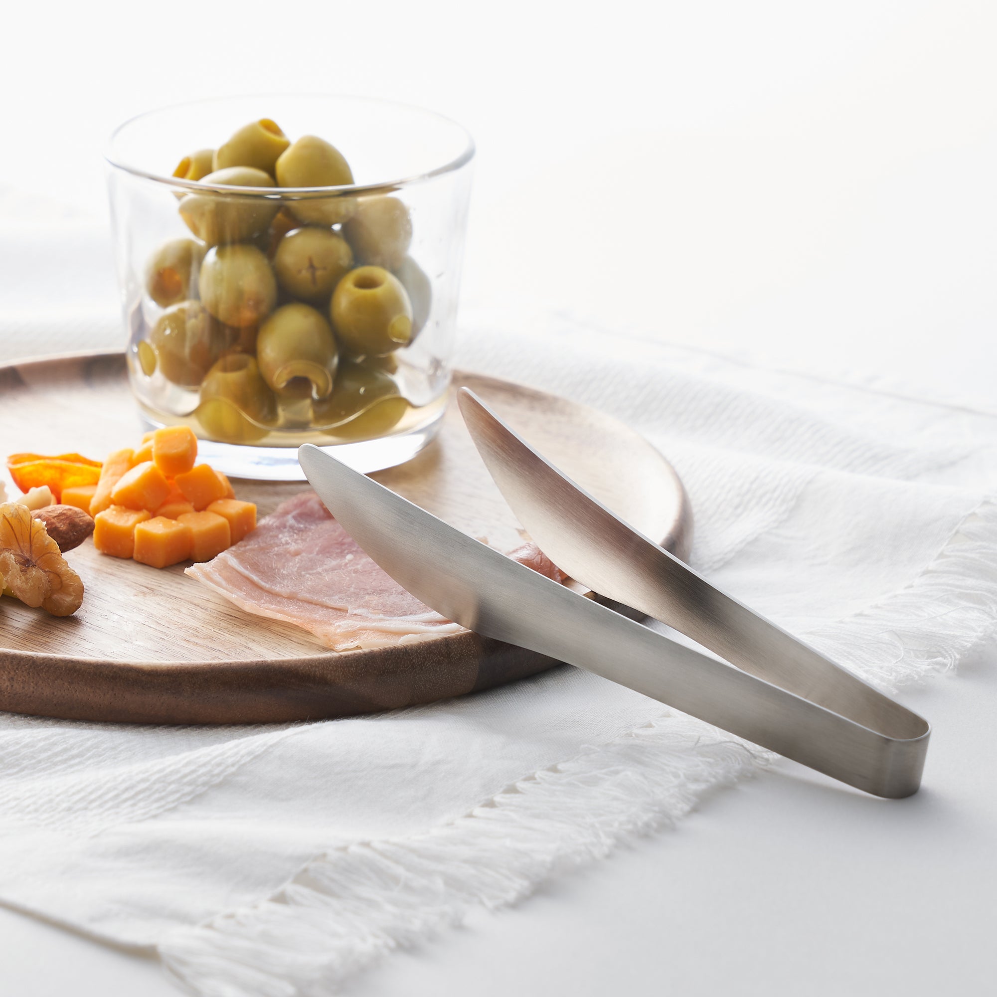 Small stainless steel tongs. They are perfect for snacks. a charcuterie board. plating foods. or arranging a bento box.