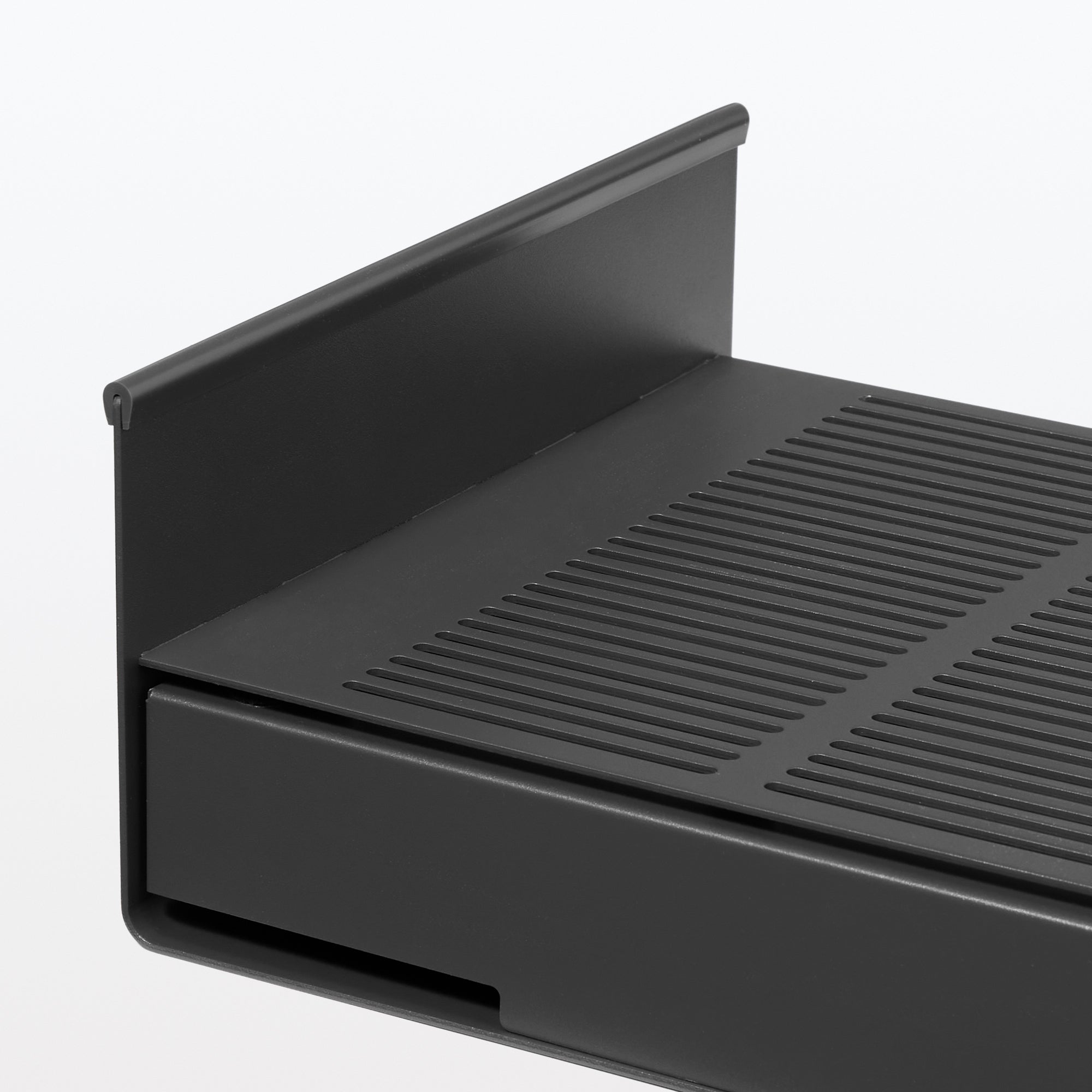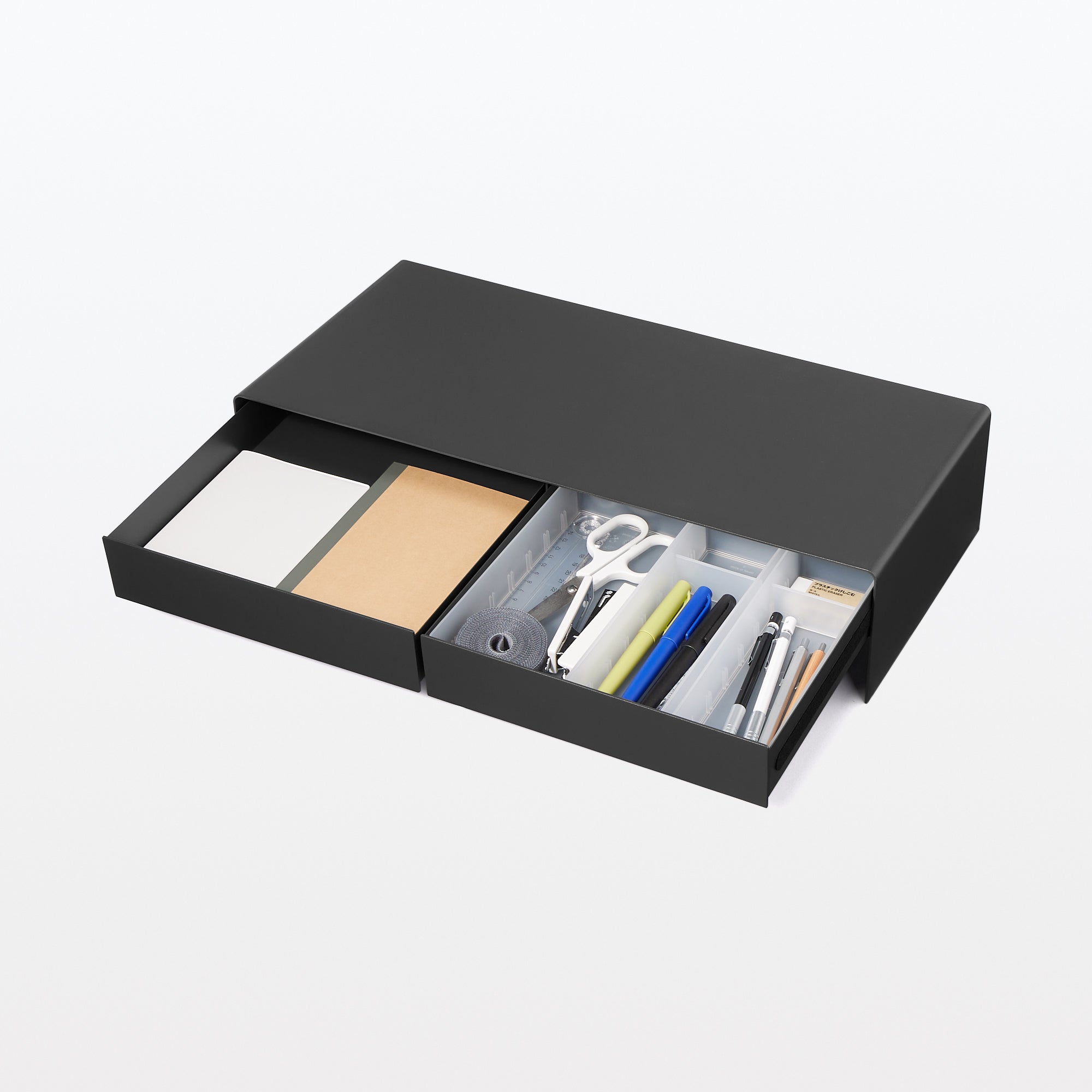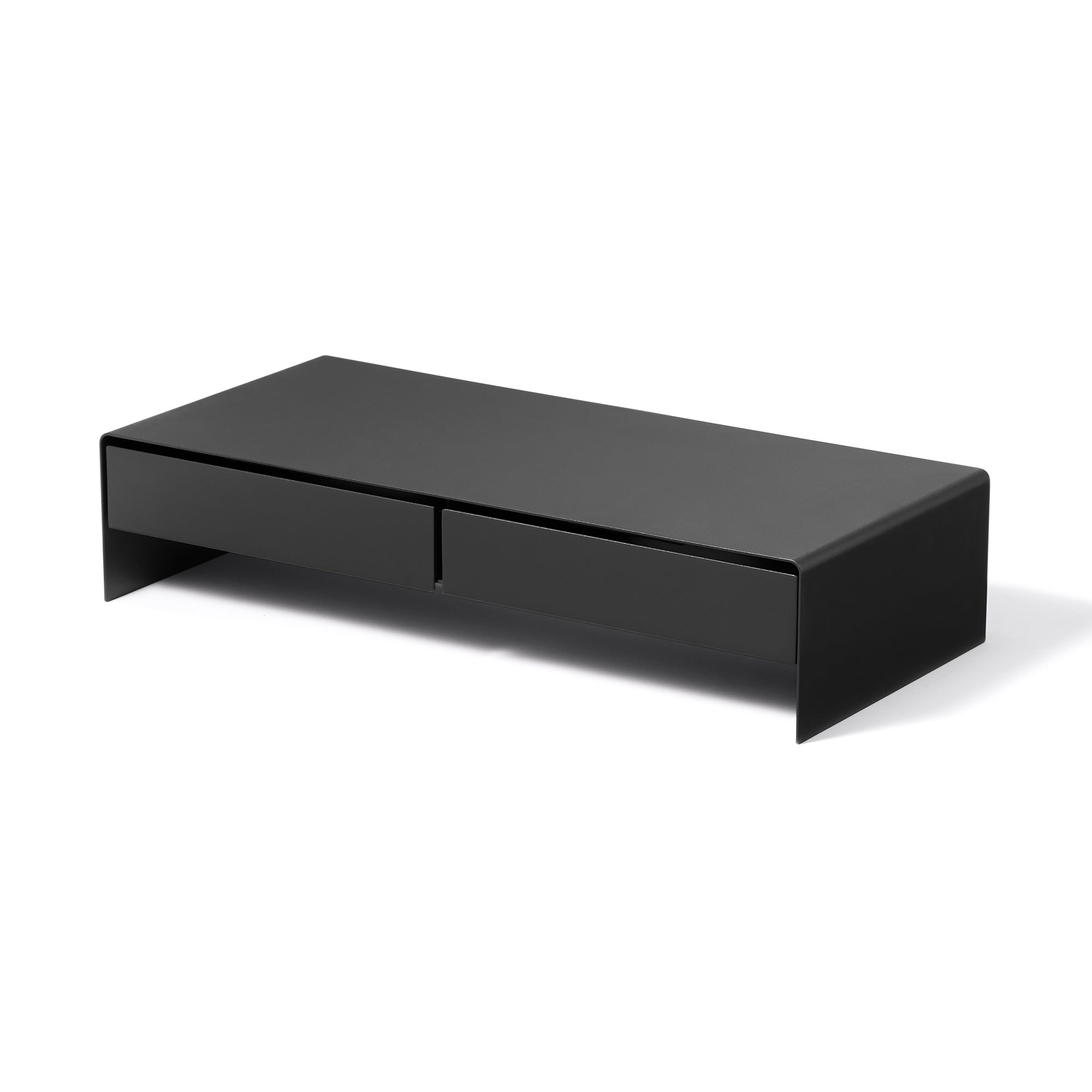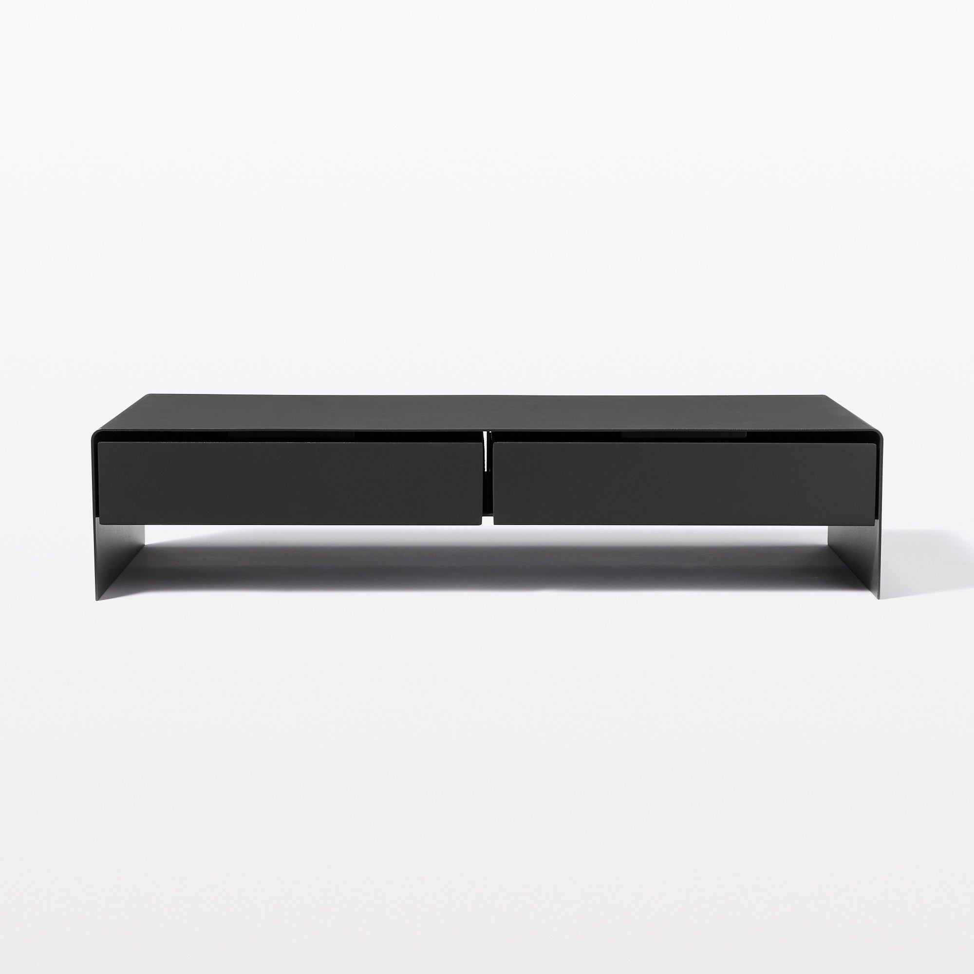 A wide monitor stand made from a single. sturdy steel plate. It can fit a standard full-size keyboard underneath. and it includes silicone resin to attach on the bottom to prevent scratches to your desk. The two drawers can be used for both item storage and cable management. There is a gap at the top of the drawers that allows you to feed cables out while maintaining a neat exterior.