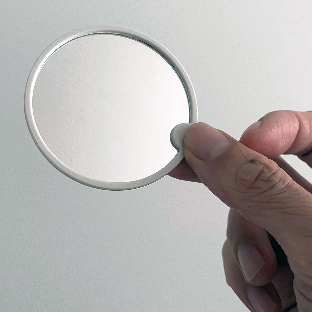 This palm-sized compact mirror is perfect for bringing with you on-the-go. taking up little space in your bag or pocket. The edge of the mirror is designed so you can hold it without smudging it with your thumb. It comes with a small case to protect the glass from getting dirty when not in use.