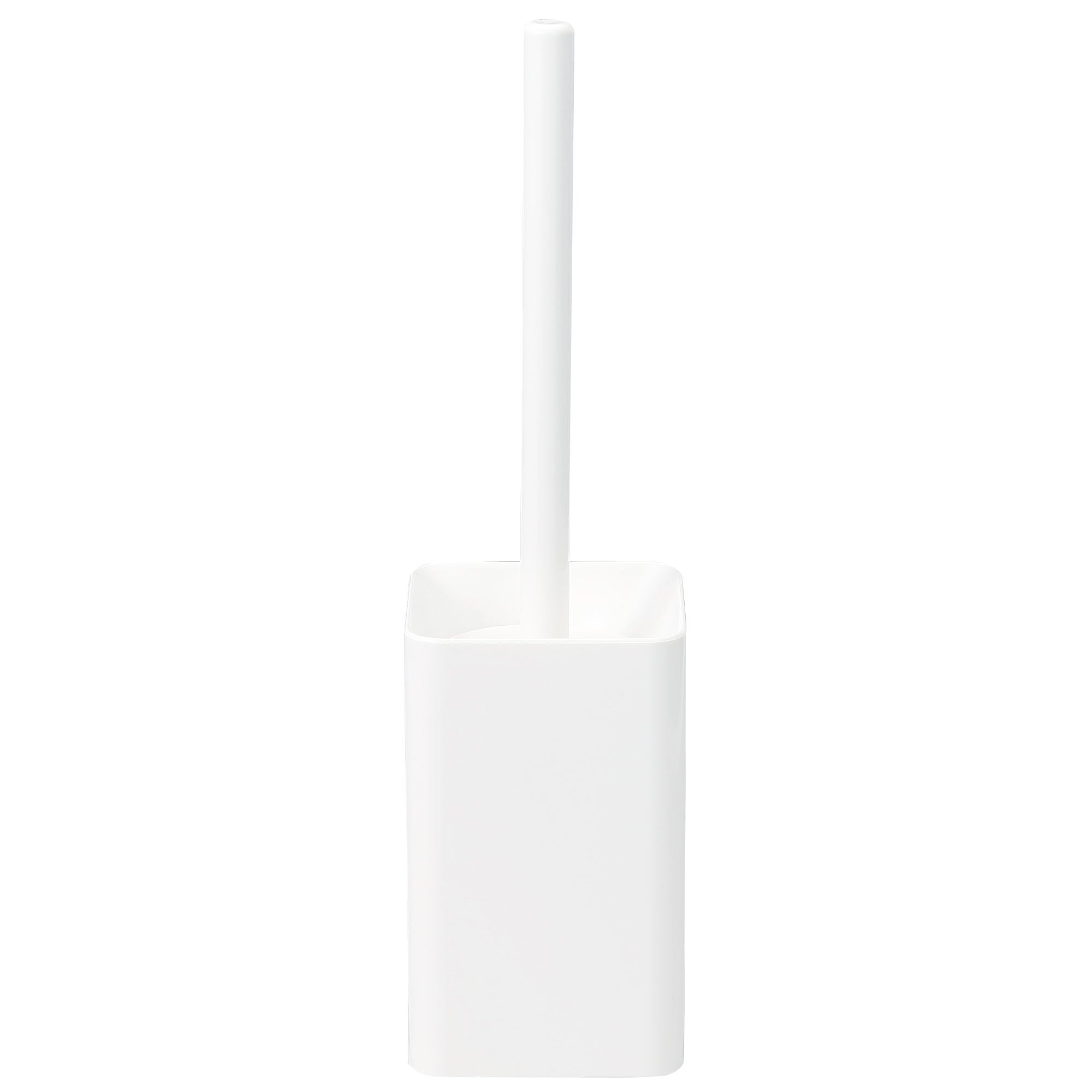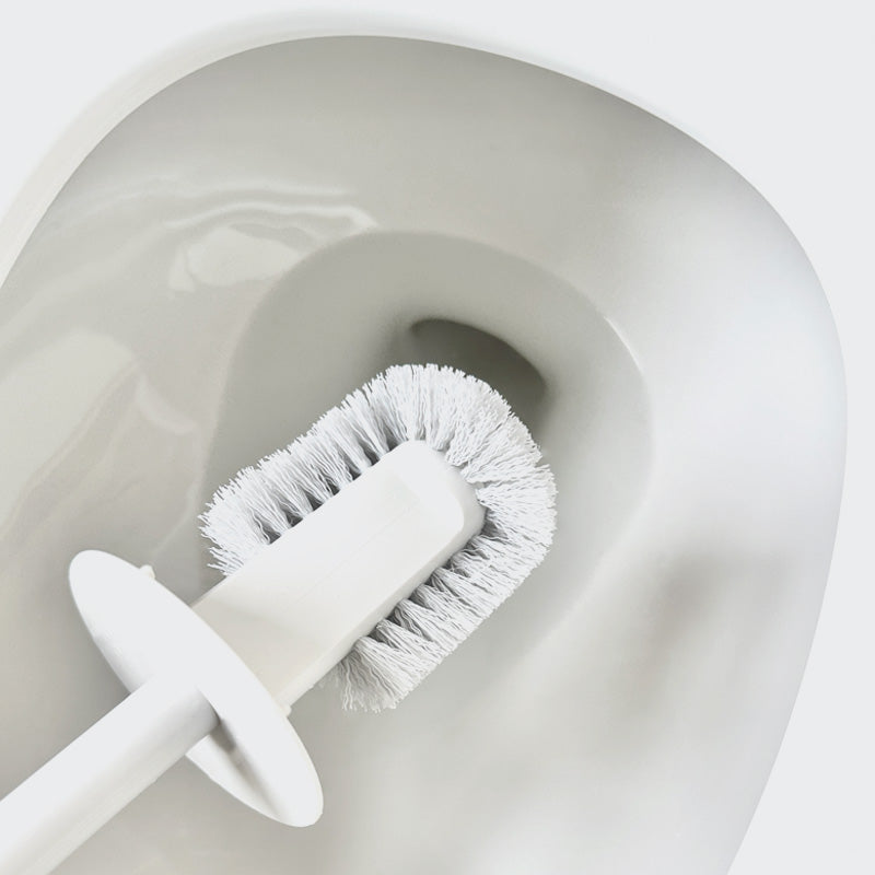 A minimalistic toilet brush with a rectangular case can be stored in the corner of the bathroom. It is cut out on one side with a lip to let it dry before putting it back in the case. This prevents having as much bacteria. moisture. and odor buildup.