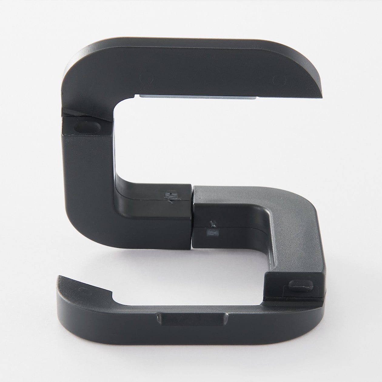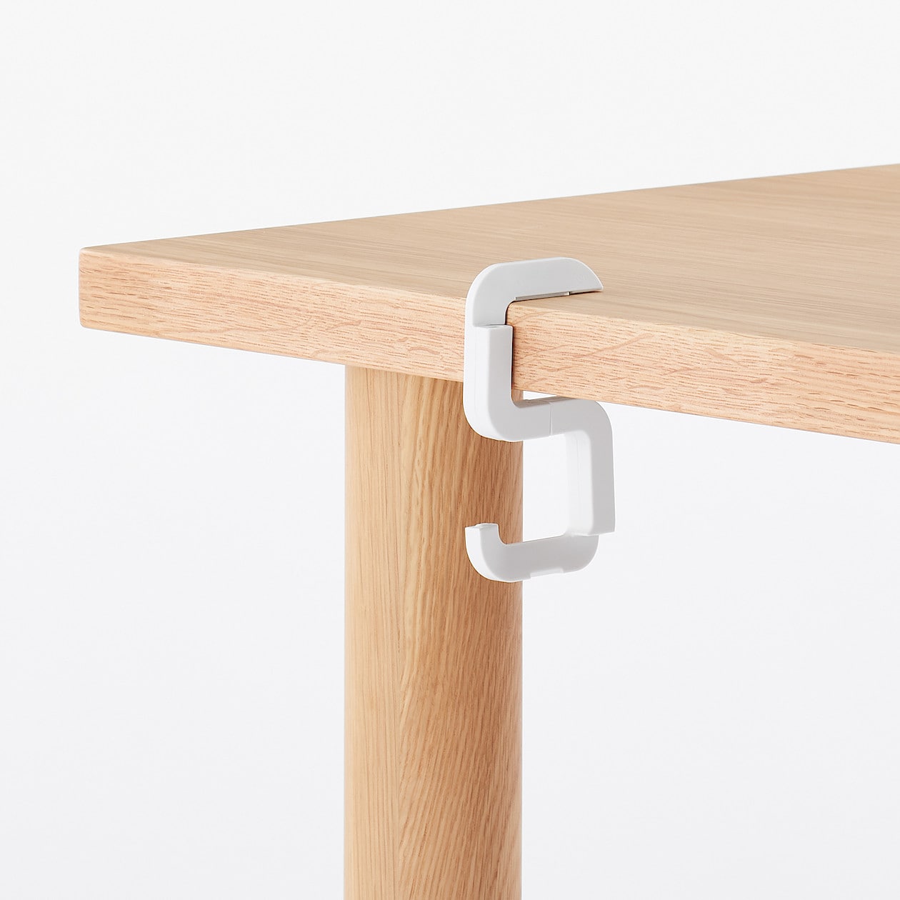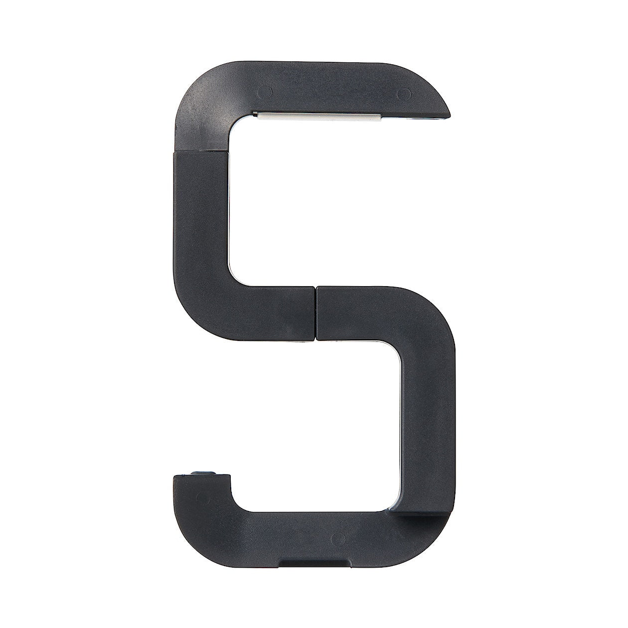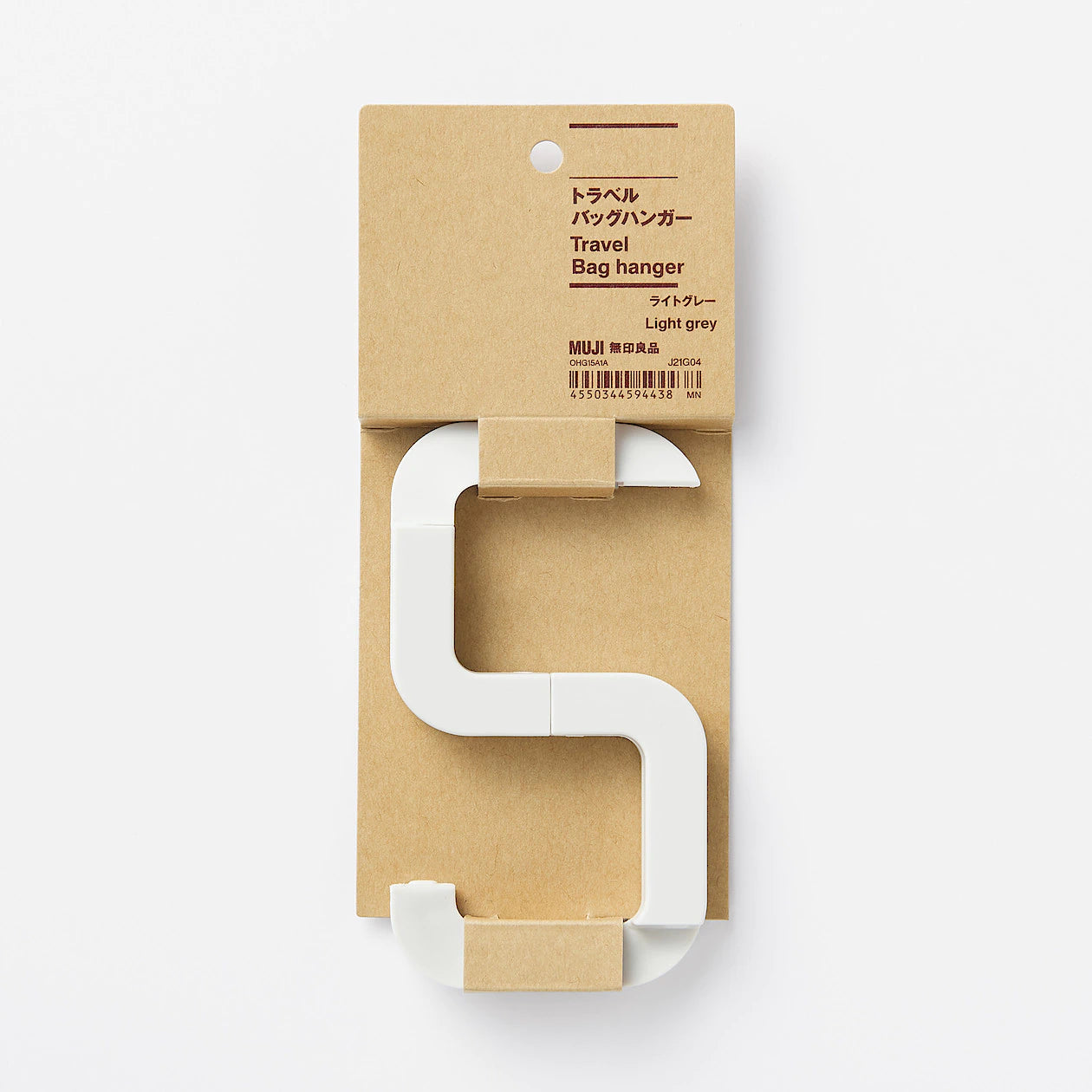 A foldable S-shaped hook. which is convenient for hanging bags on-the-go. and organizing small items such as pouches. The hook has anti-slip patches so you can use it to hang items off a tabletop without them falling.