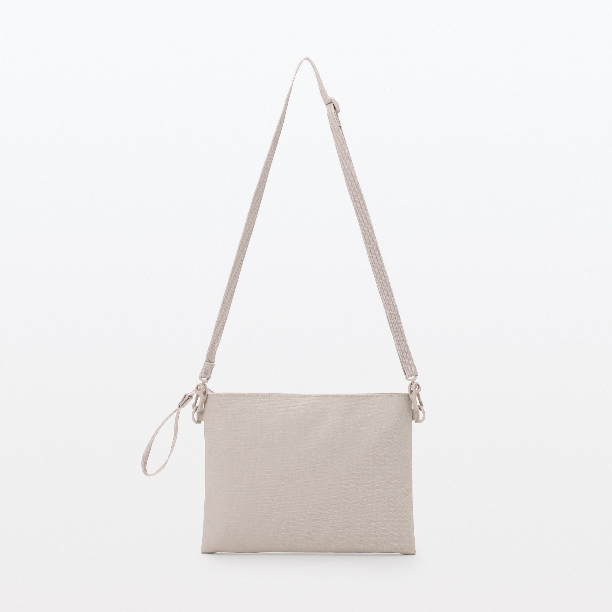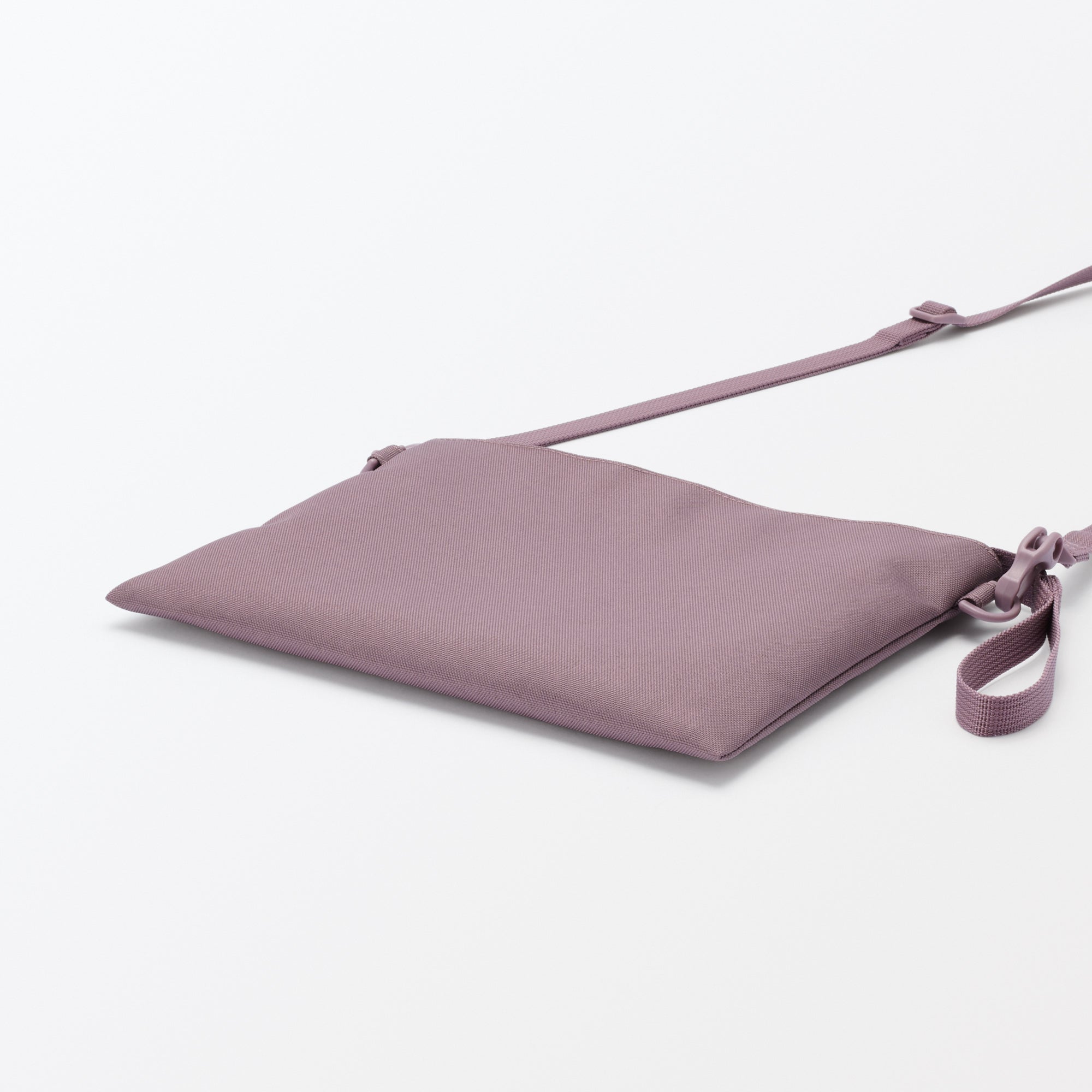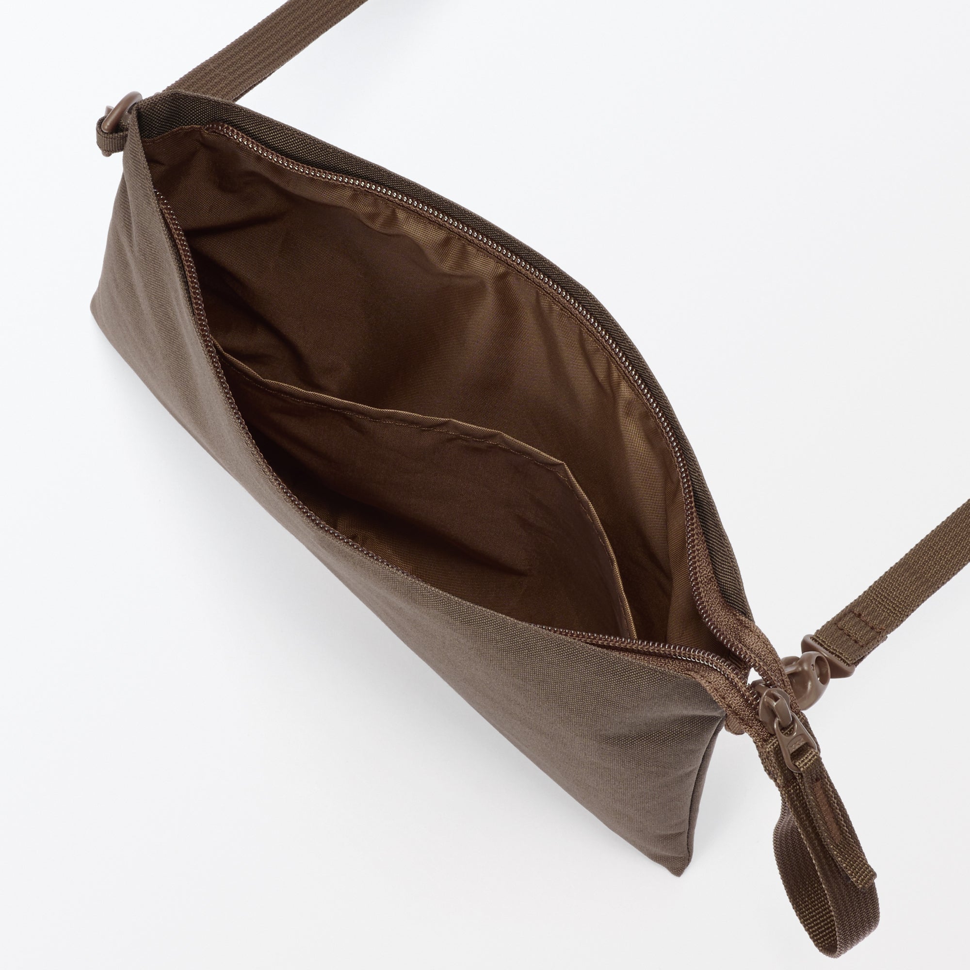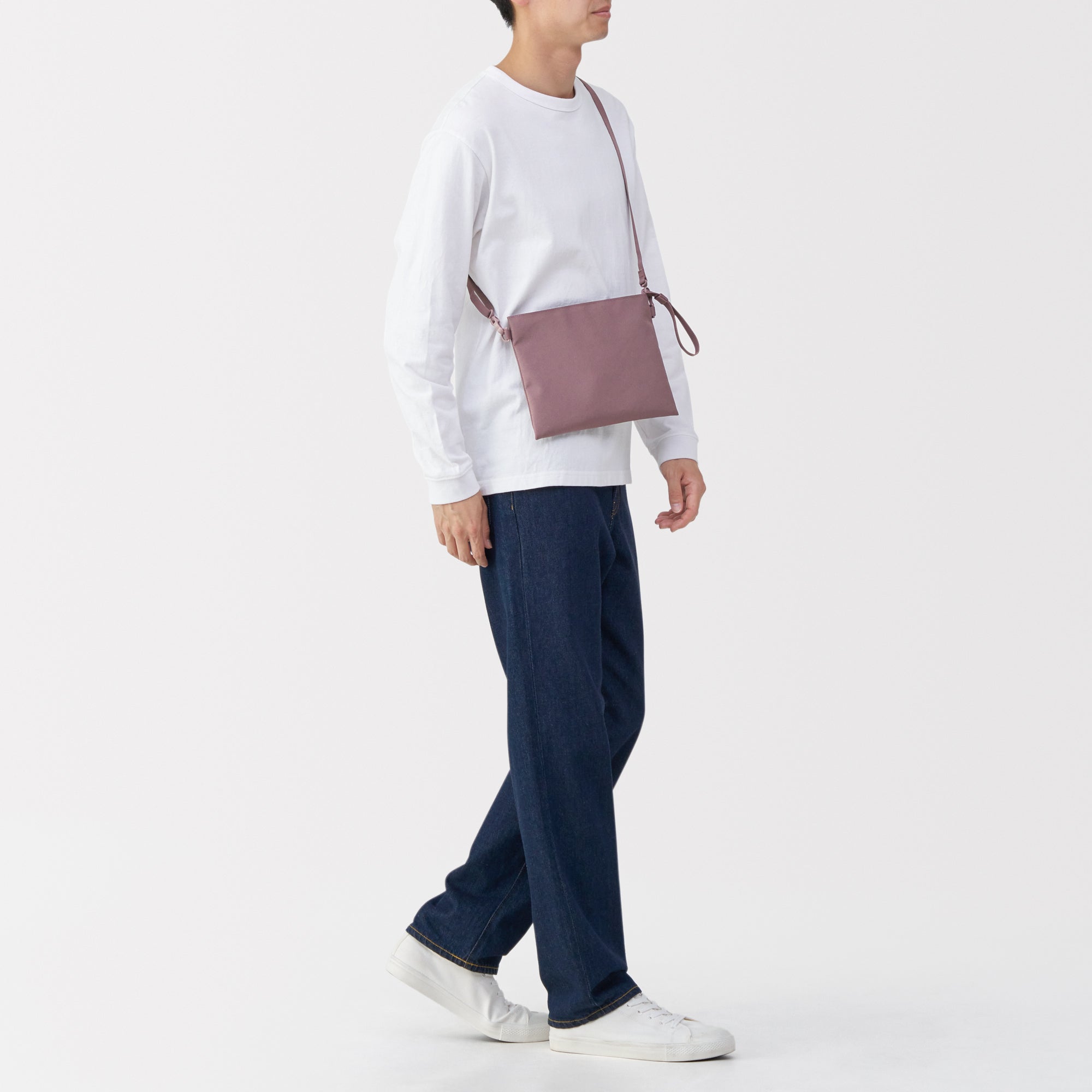 This compact. shoulder-slung pouch is the perfect size to hold all of your daily necessities for quick outings. Made from recycled polyester. it has a water repellent coating to protect your belongings. There is an interior divider to help keep its contents organized and easy to find.