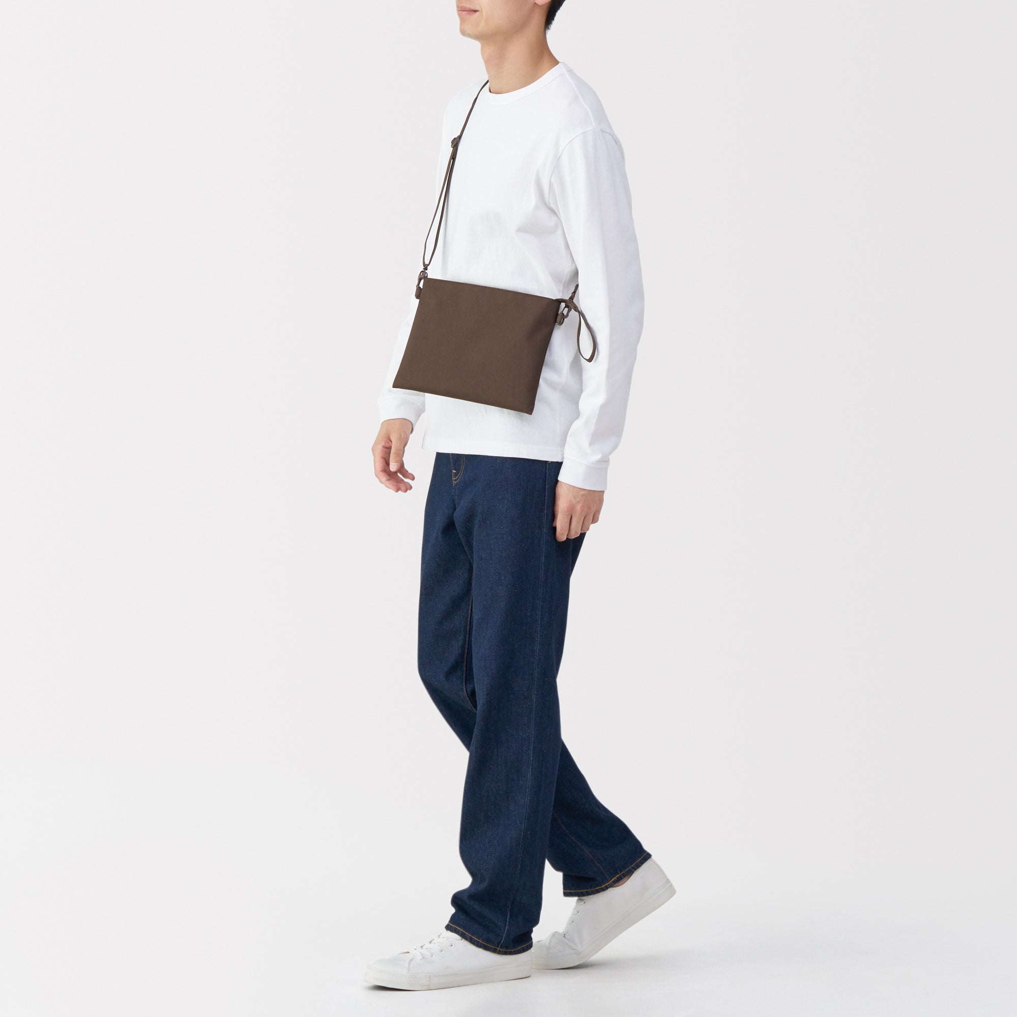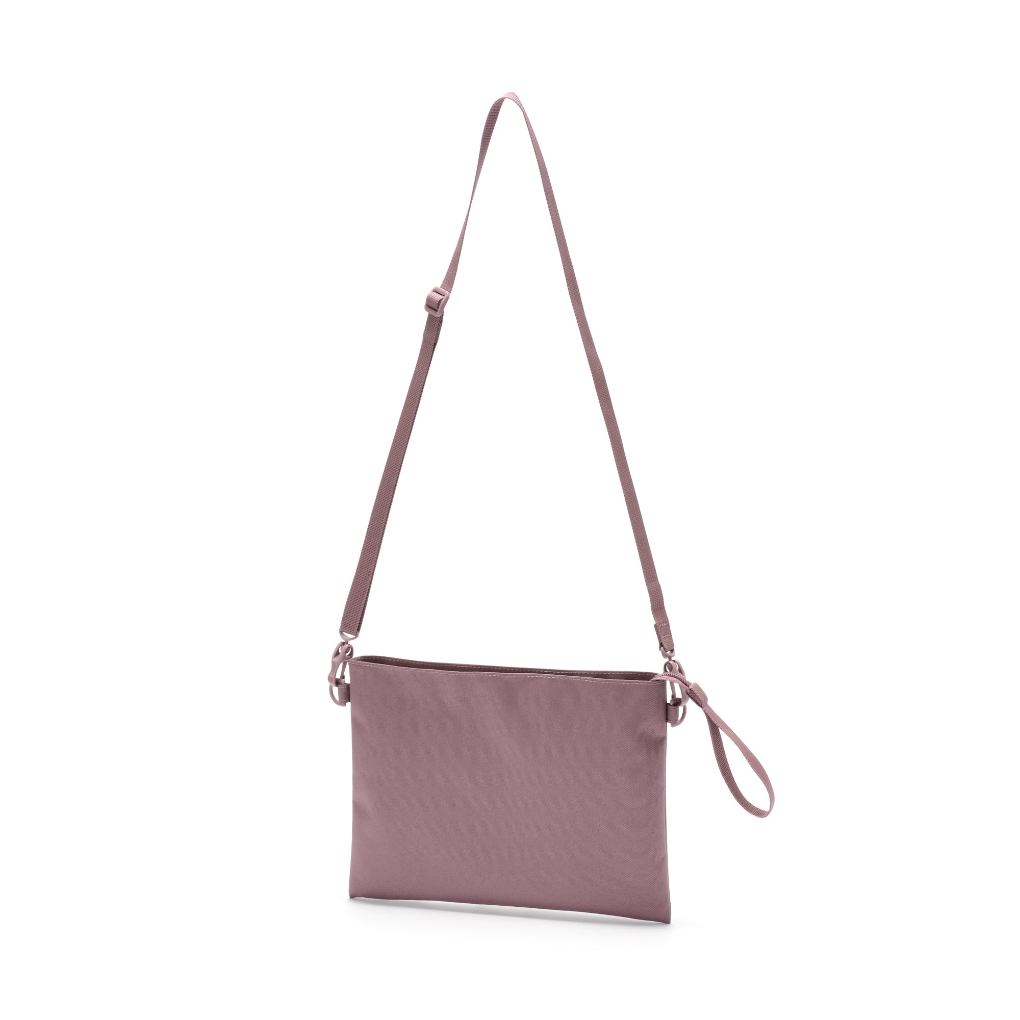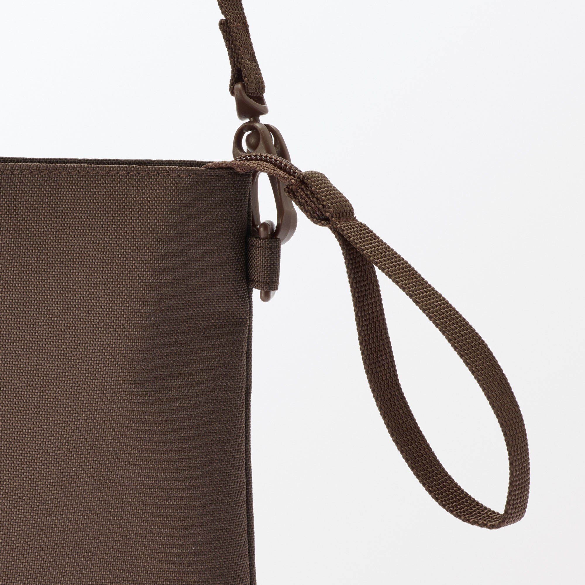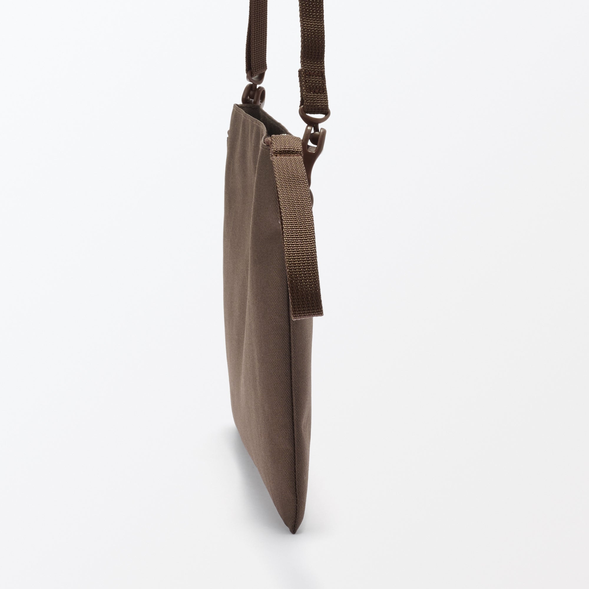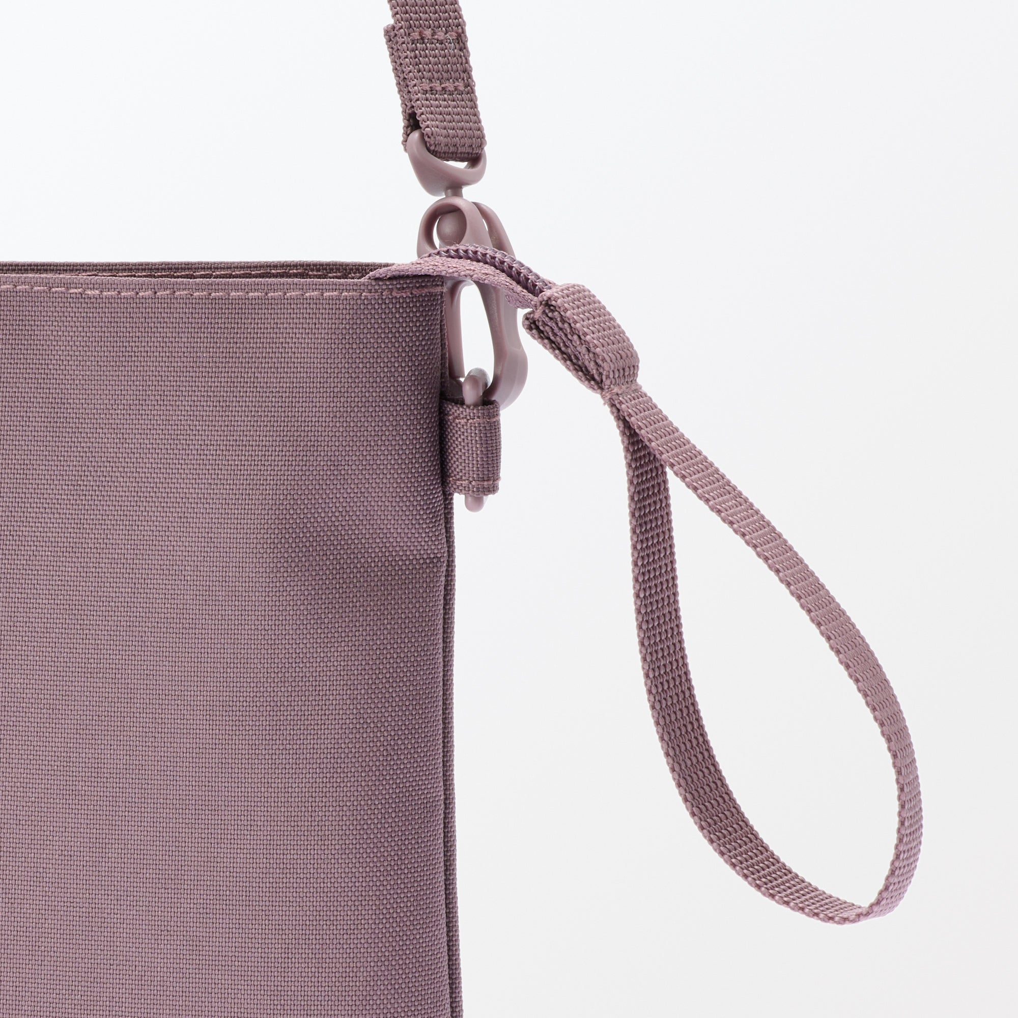 This compact. shoulder-slung pouch is the perfect size to hold all of your daily necessities for quick outings. Made from recycled polyester. it has a water repellent coating to protect your belongings. There is an interior divider to help keep its contents organized and easy to find.