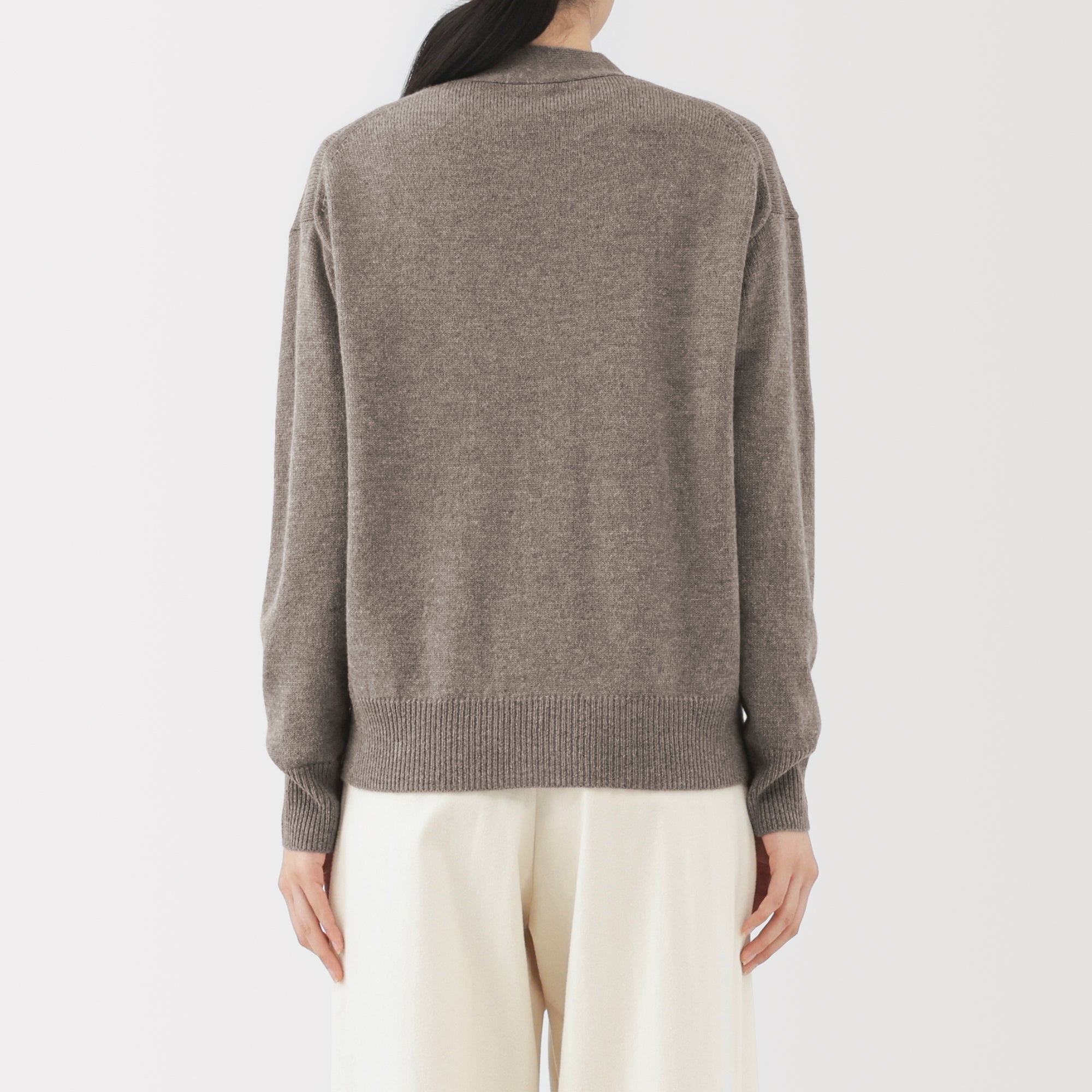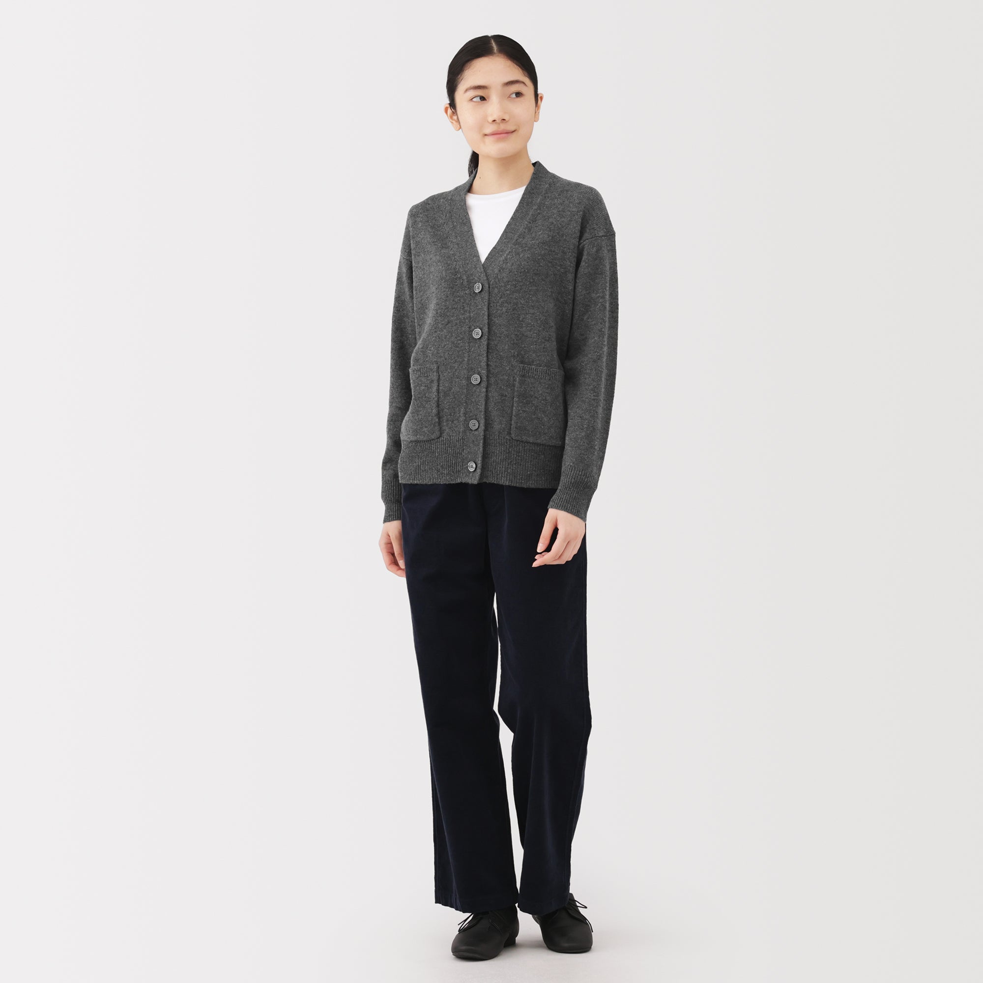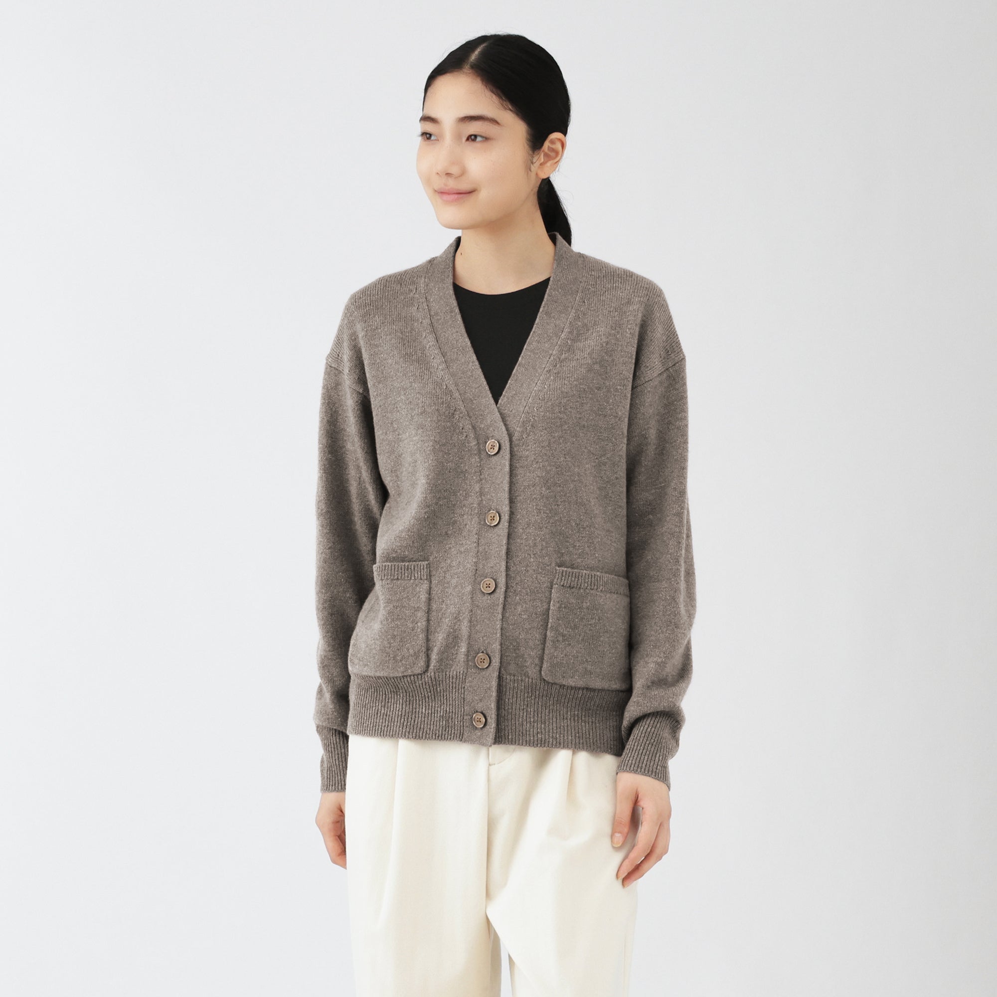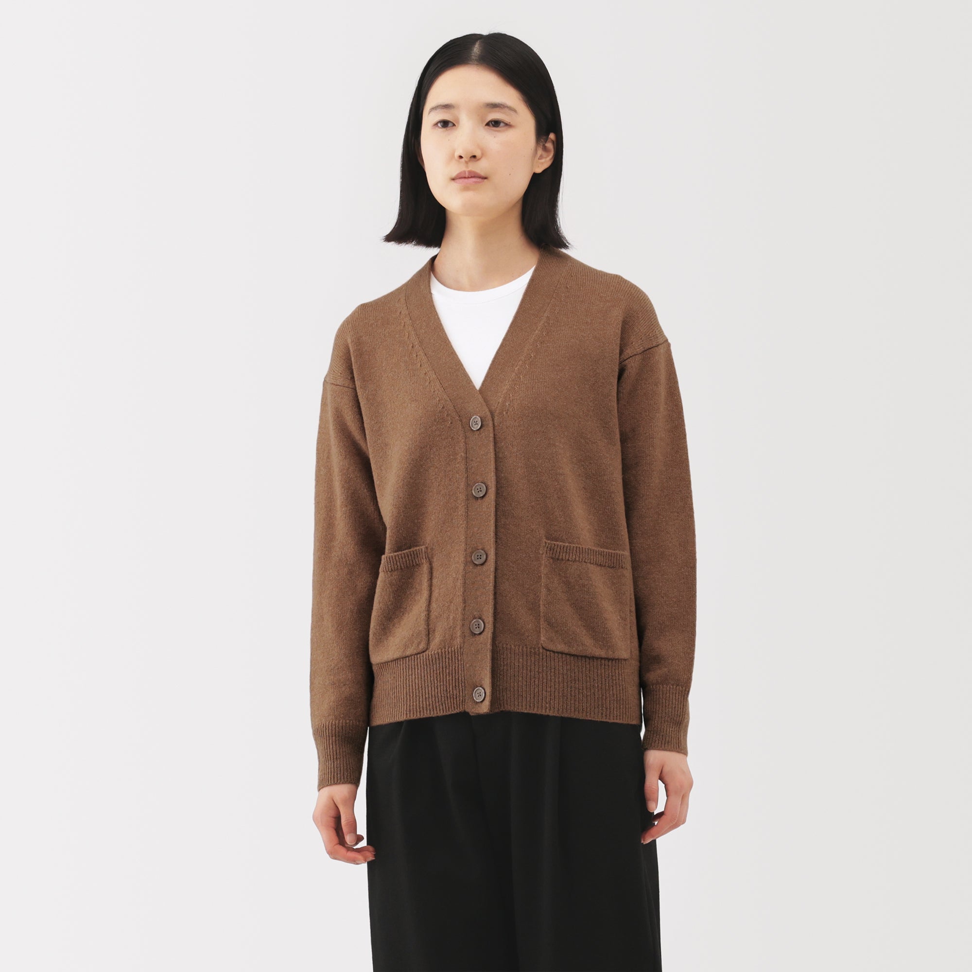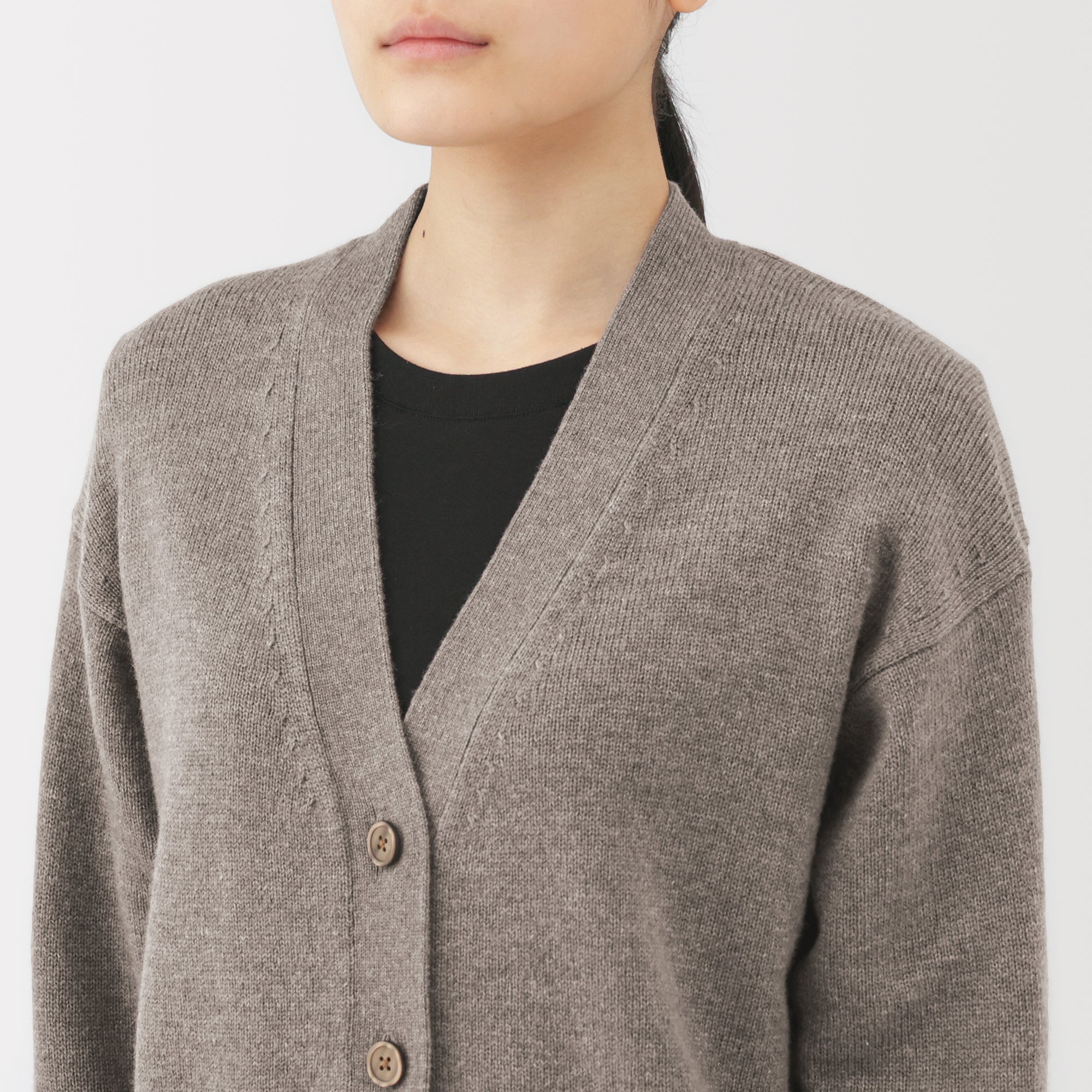 This women’s V-neck cardigan is soft and cozy. made from fine. durable mid-gauge wool thread that is smooth on the skin. The wool material ensures warmth for versatile styling on its own or as a layering piece on chilly days. It also features a shrink-proof finish. making it easily washable at home.