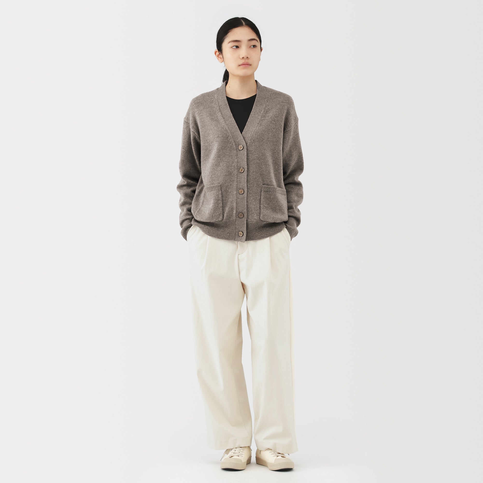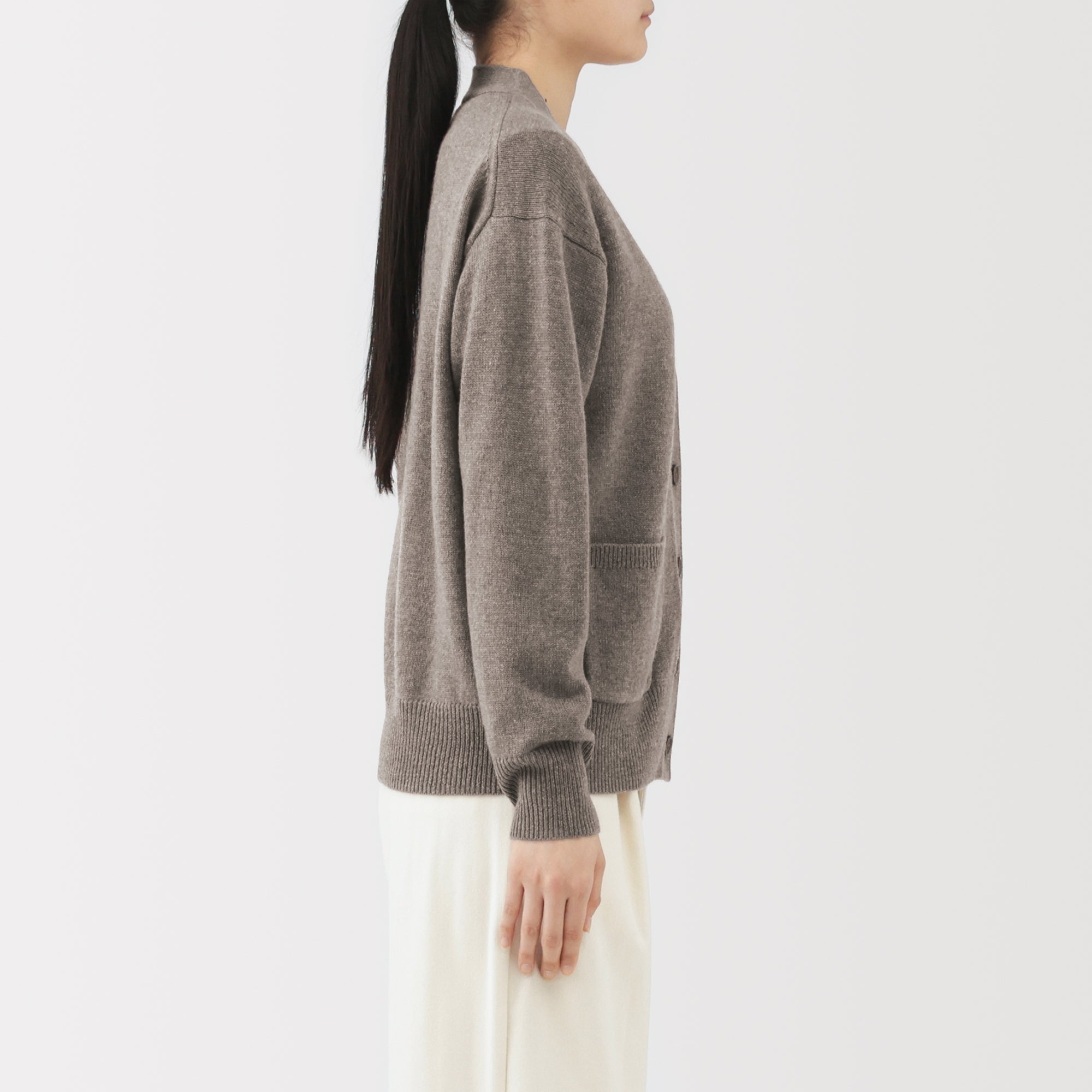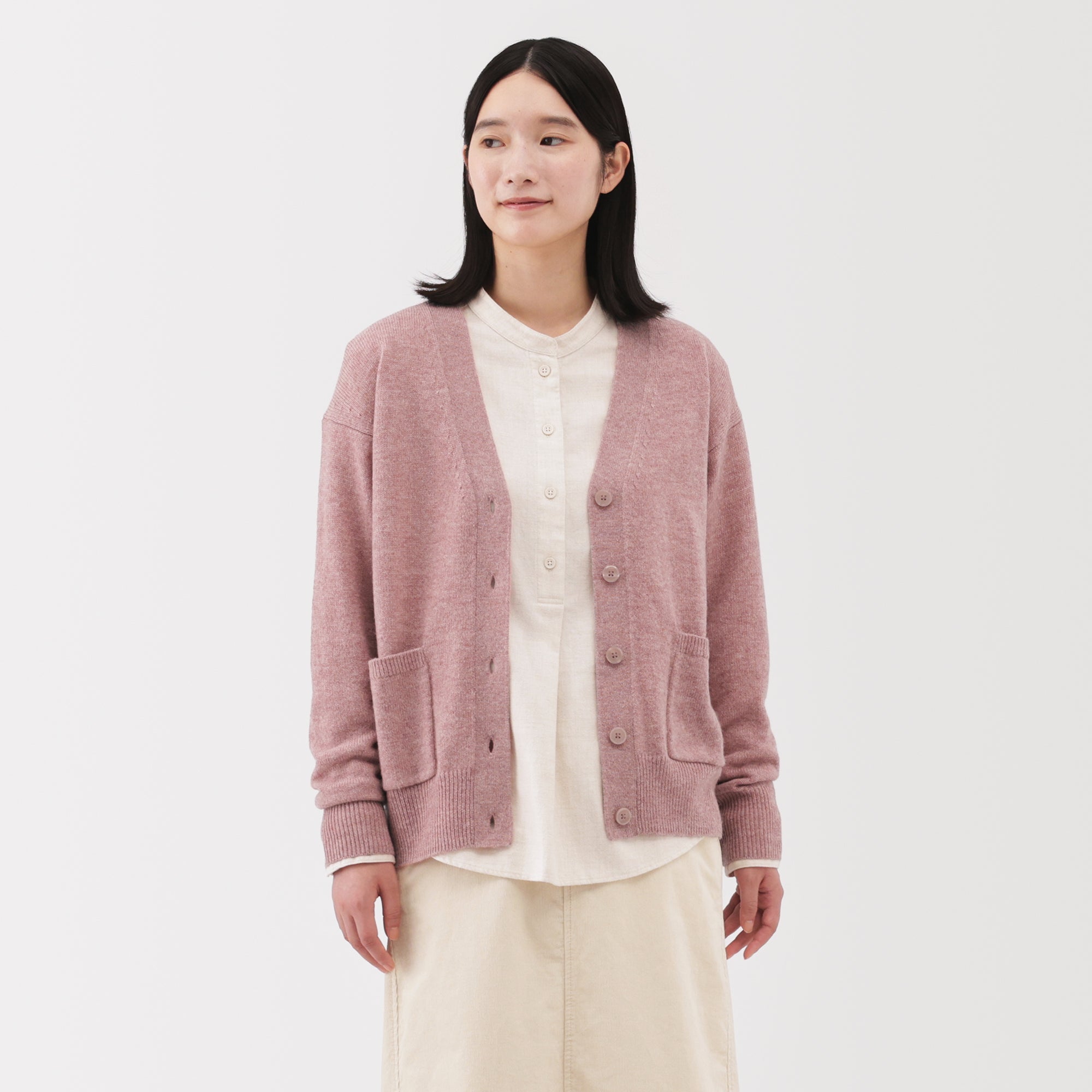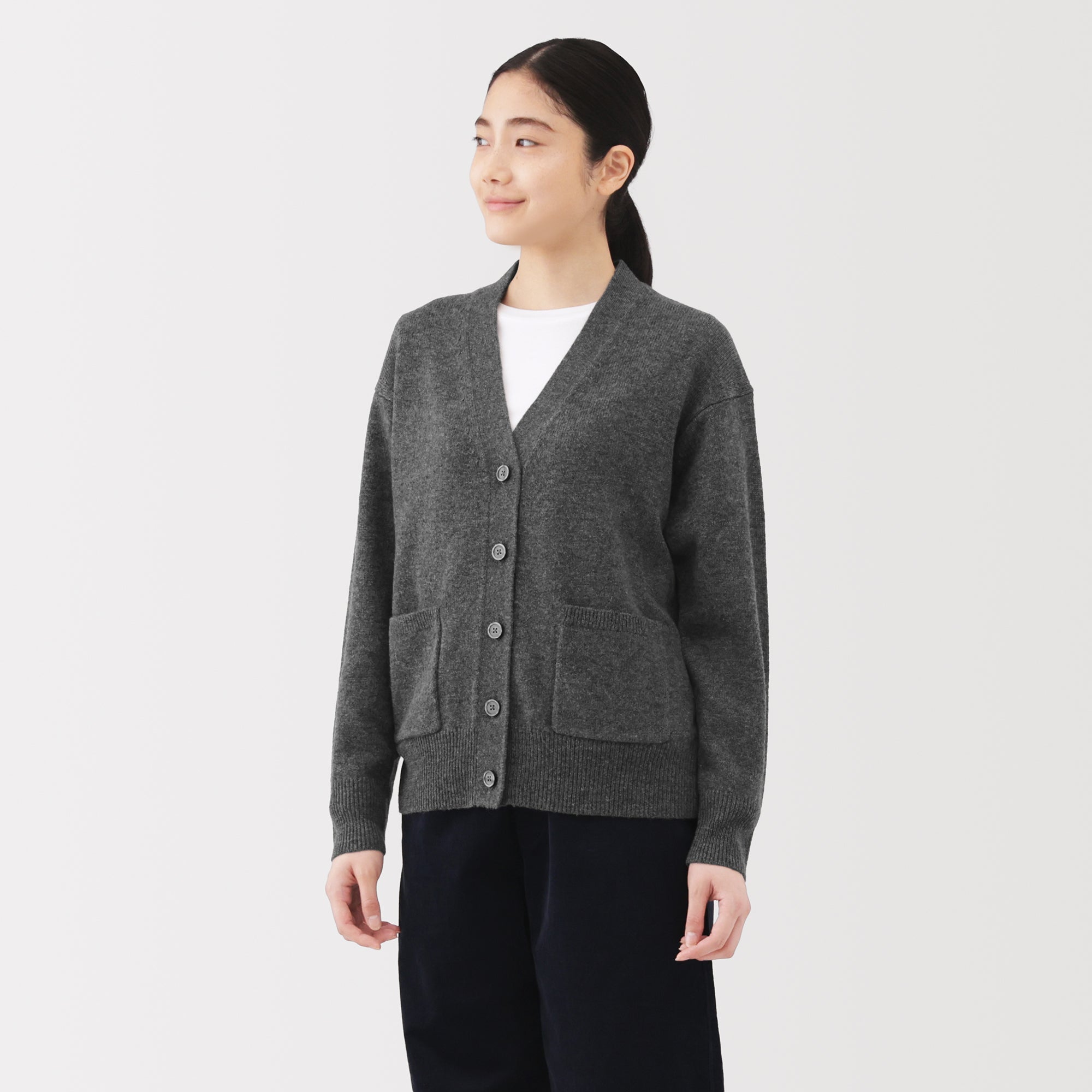 This women’s V-neck cardigan is soft and cozy. made from fine. durable mid-gauge wool thread that is smooth on the skin. The wool material ensures warmth for versatile styling on its own or as a layering piece on chilly days. It also features a shrink-proof finish. making it easily washable at home.