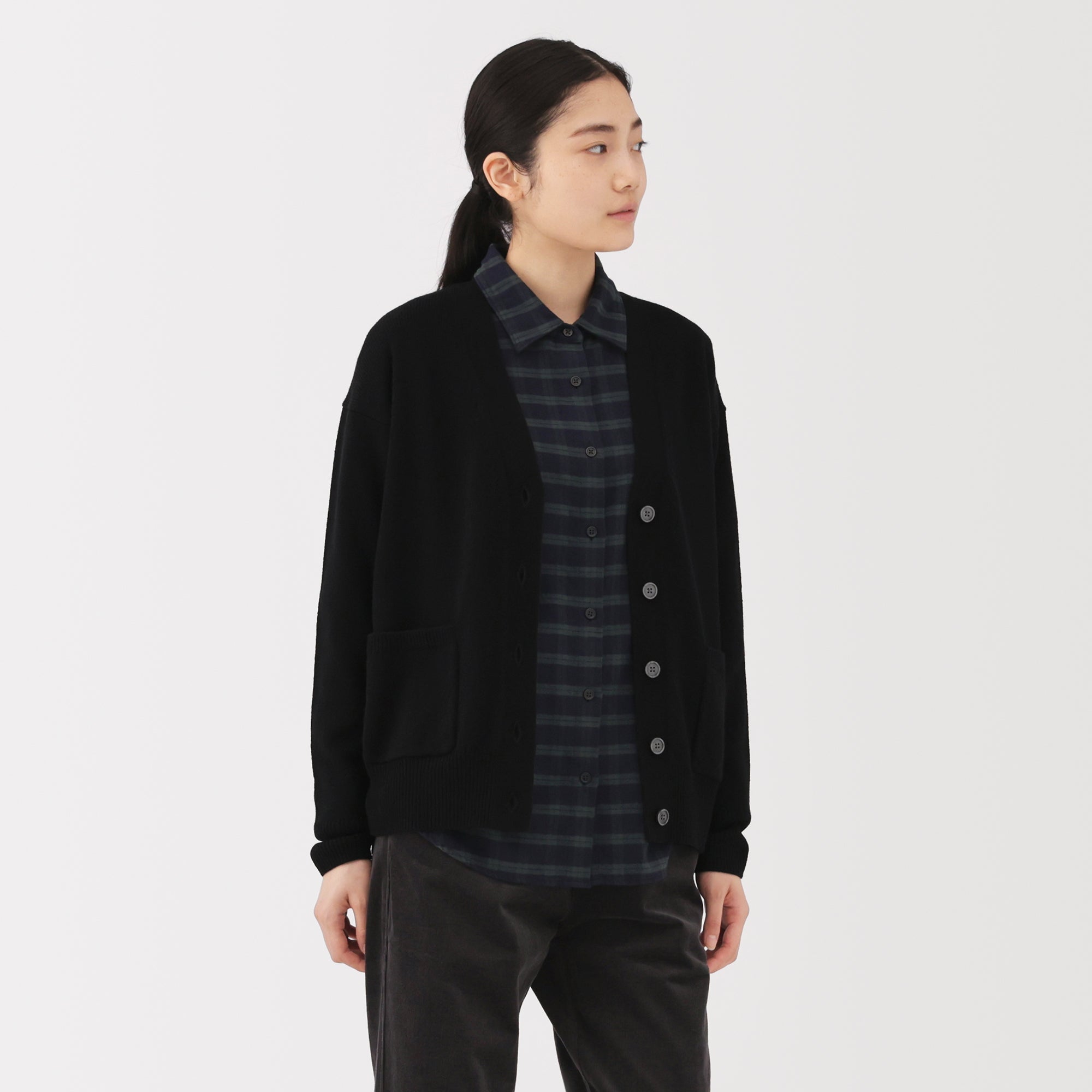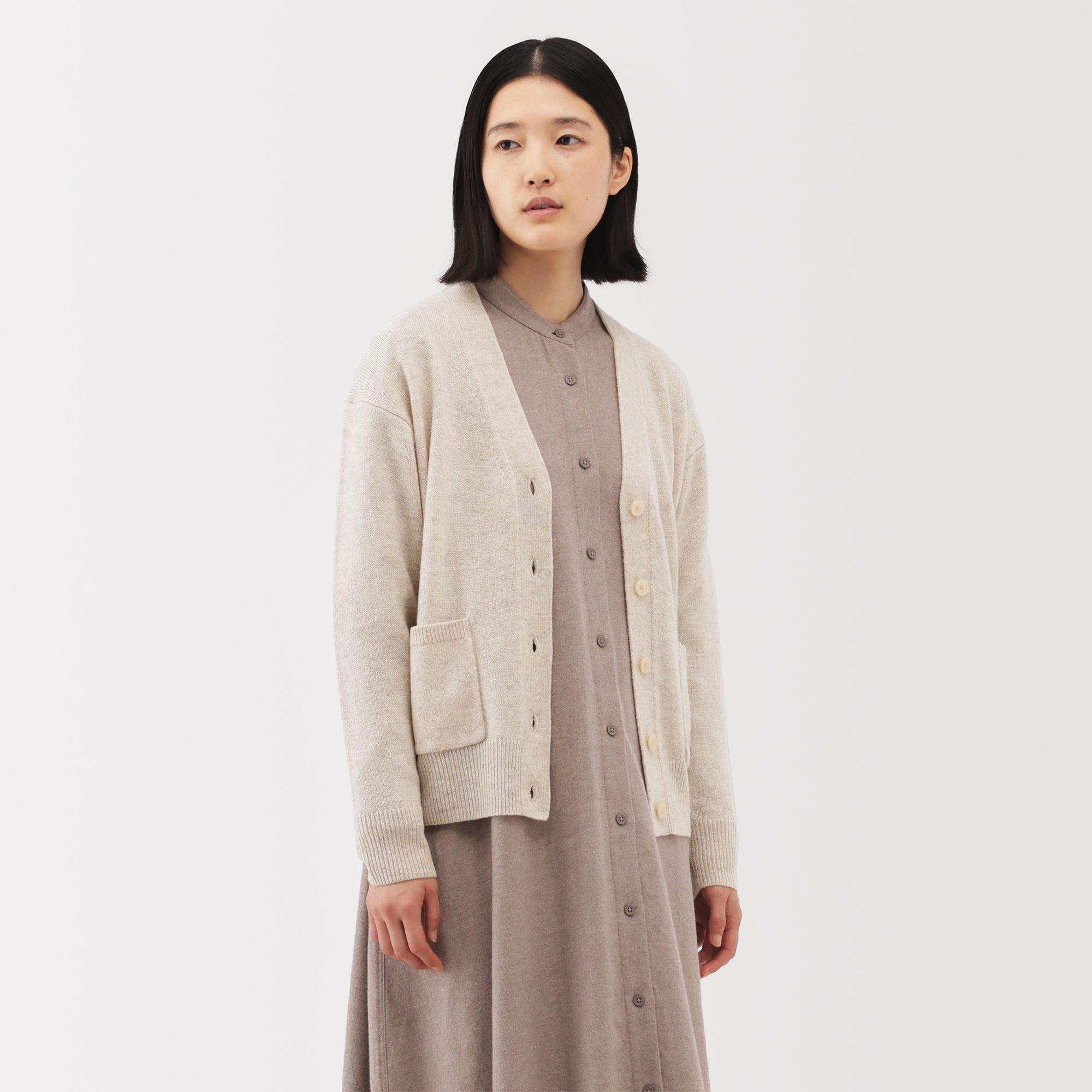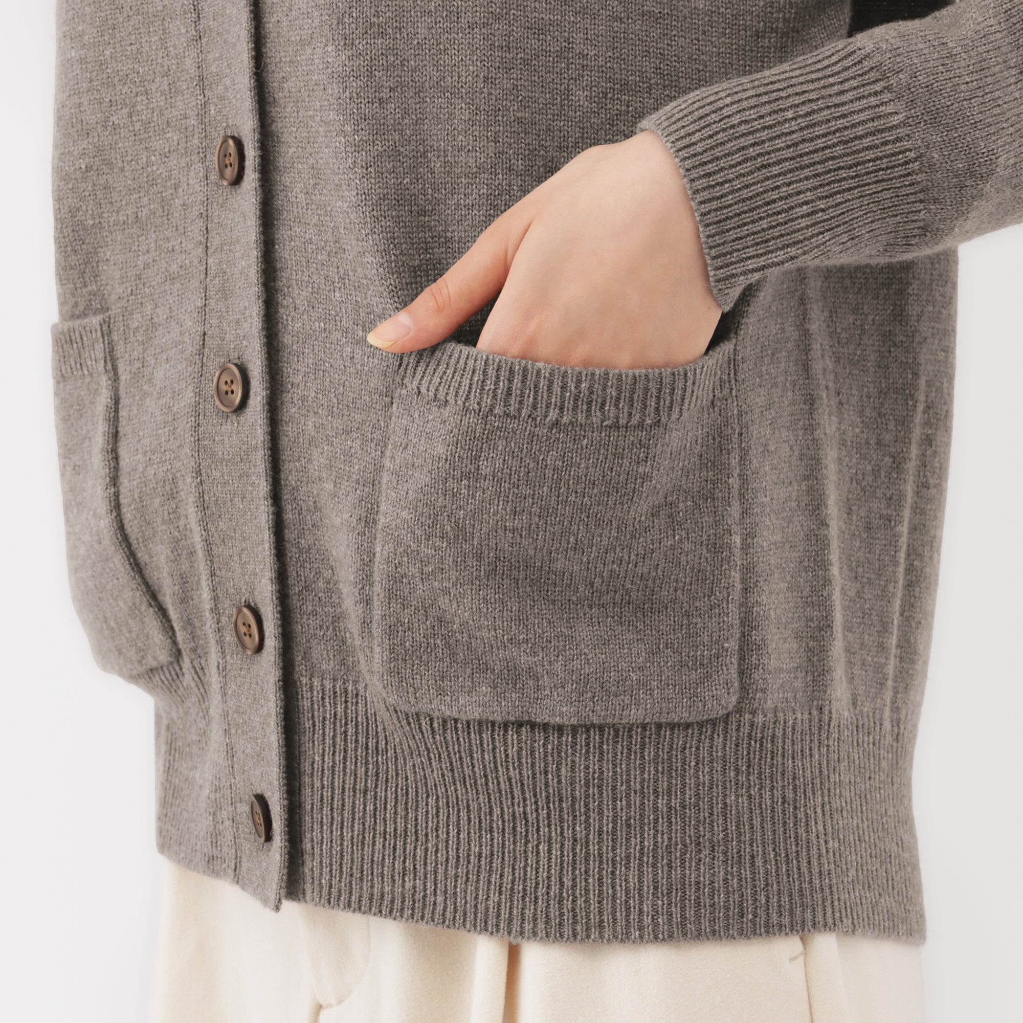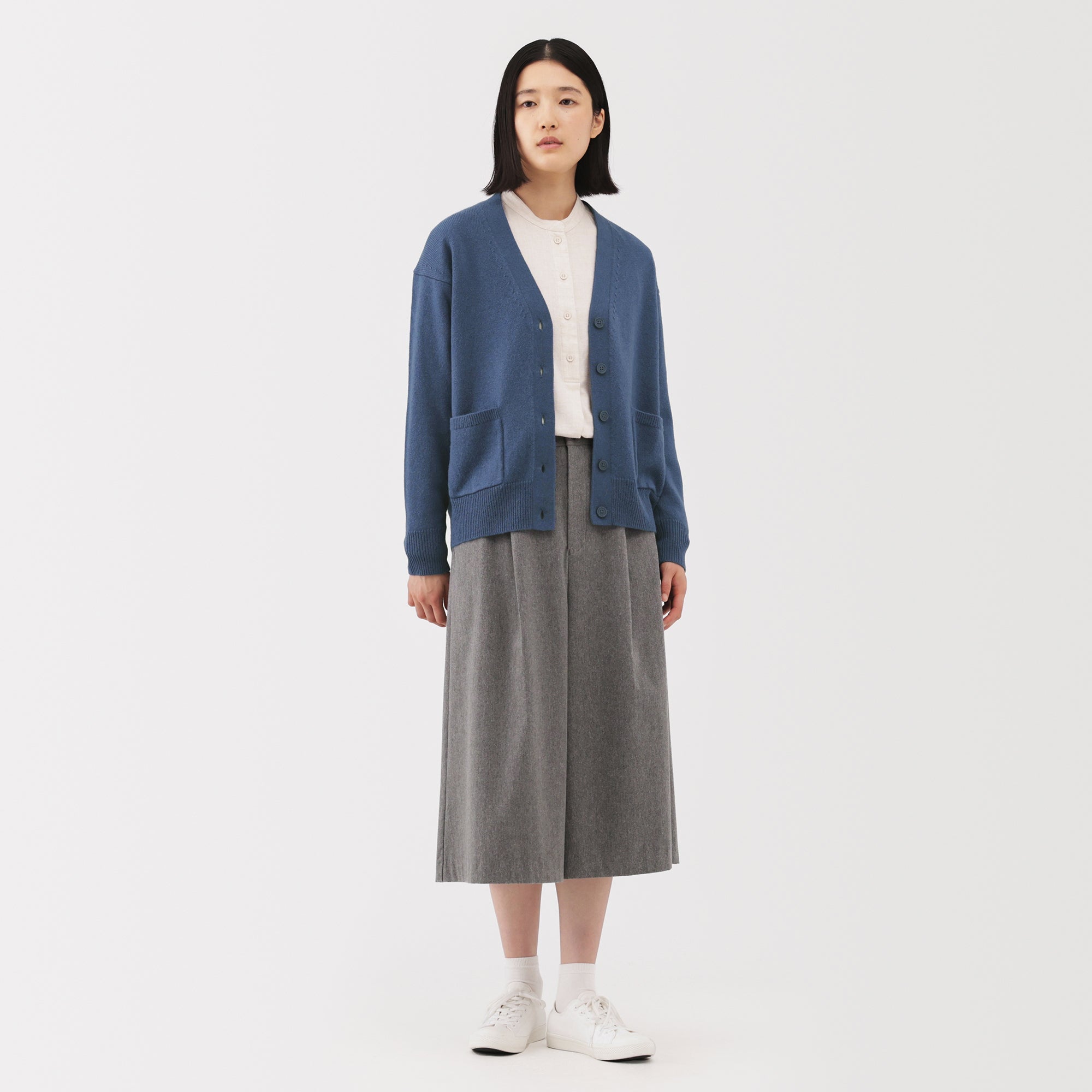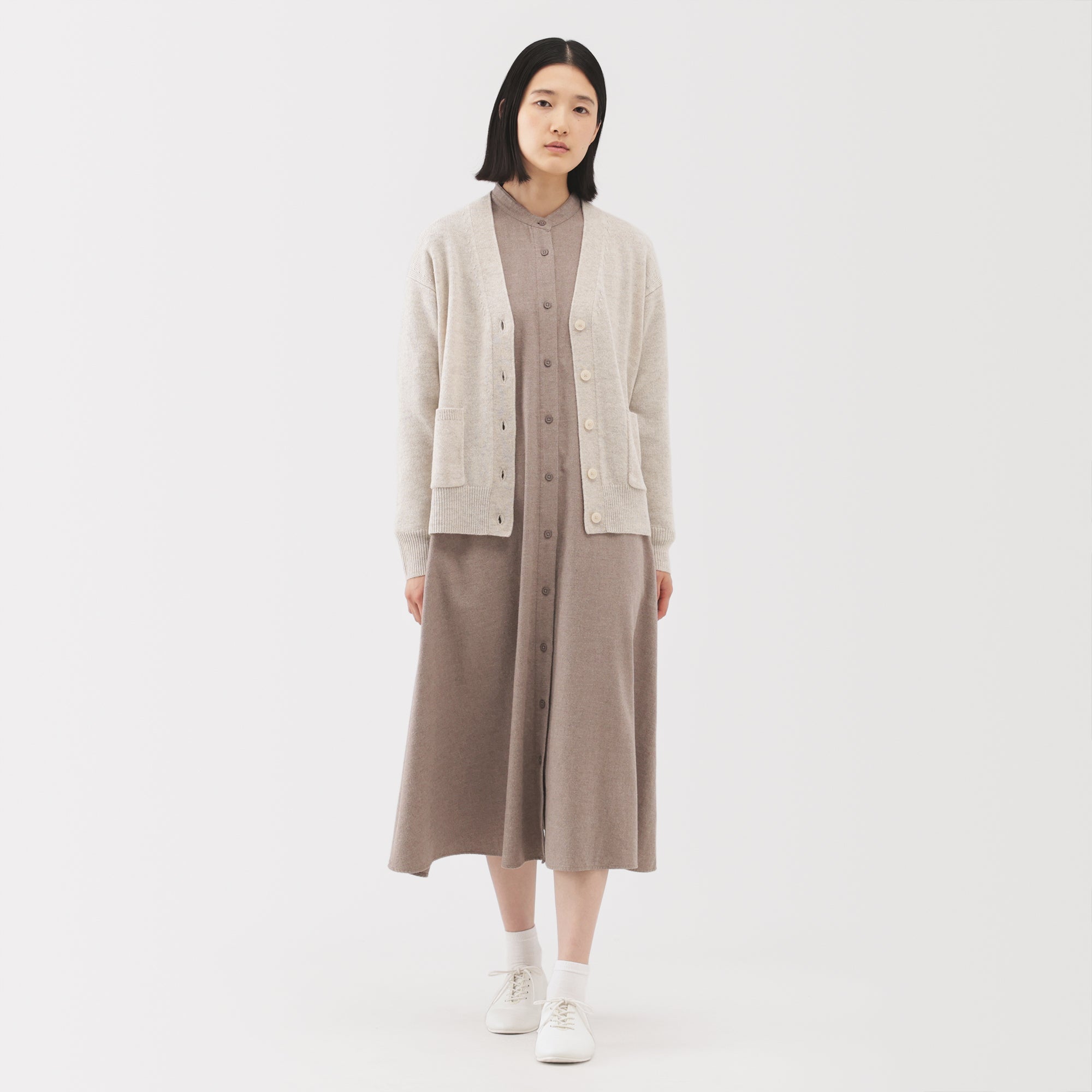 This women’s V-neck cardigan is soft and cozy. made from fine. durable mid-gauge wool thread that is smooth on the skin. The wool material ensures warmth for versatile styling on its own or as a layering piece on chilly days. It also features a shrink-proof finish. making it easily washable at home.