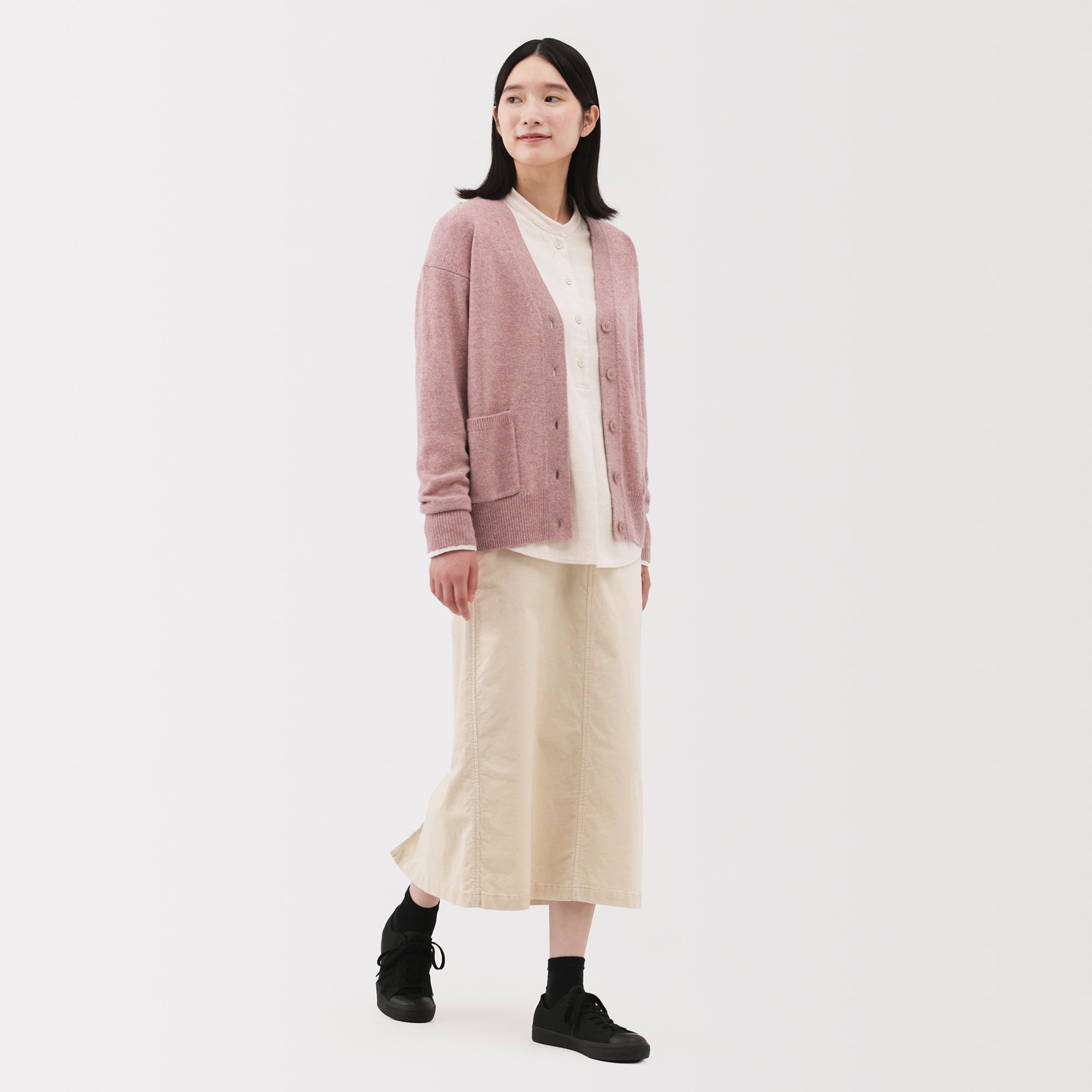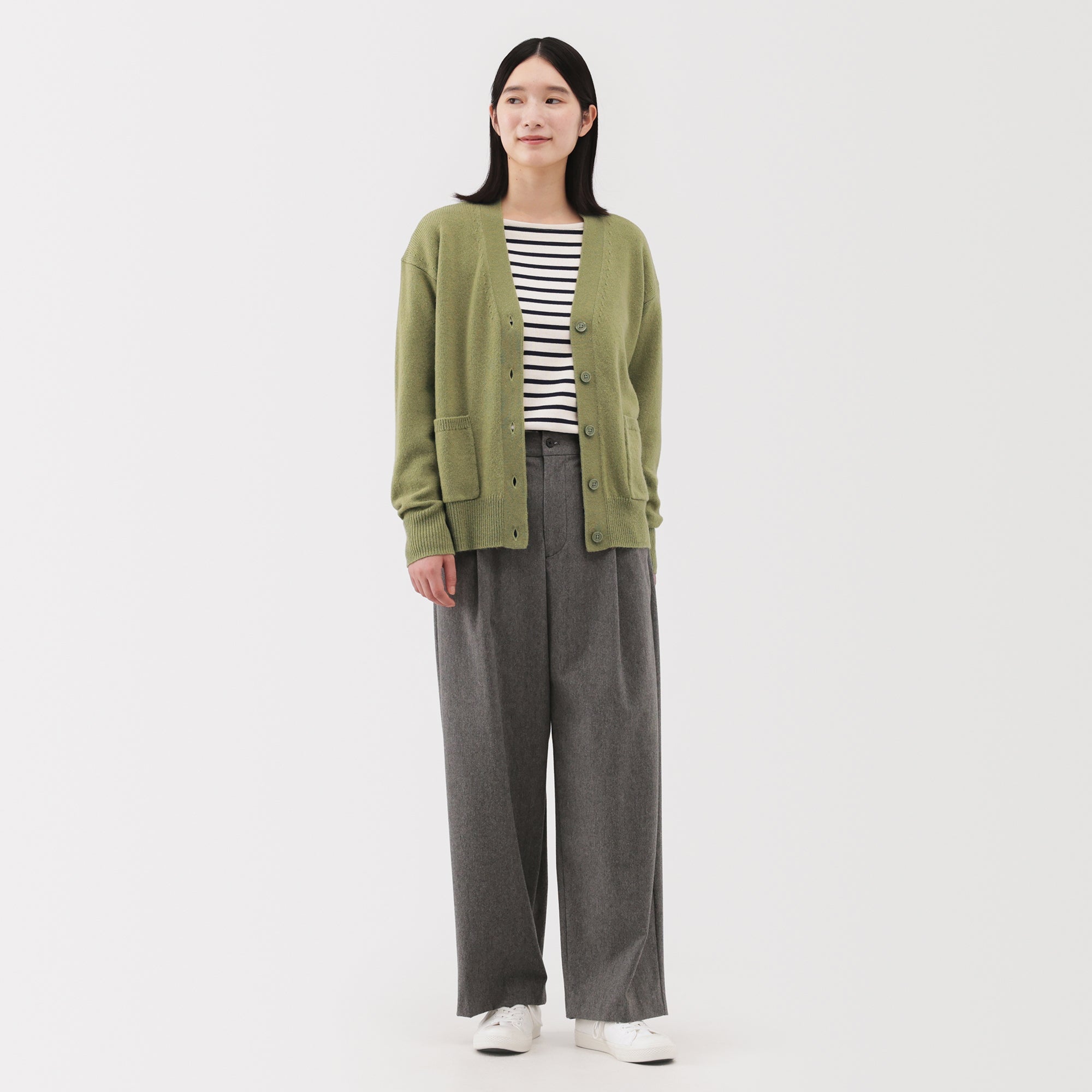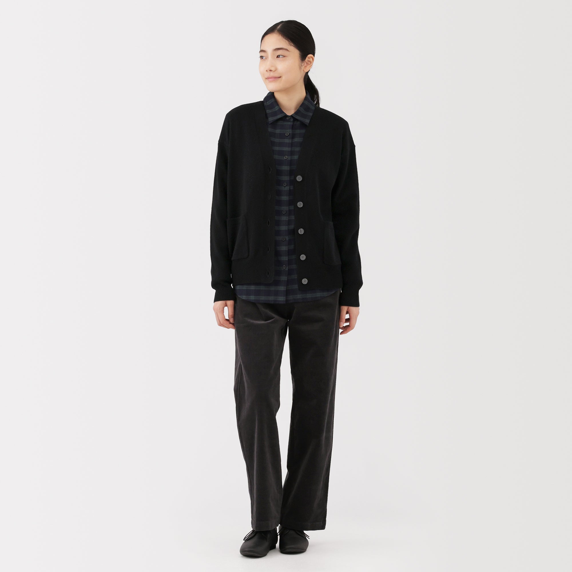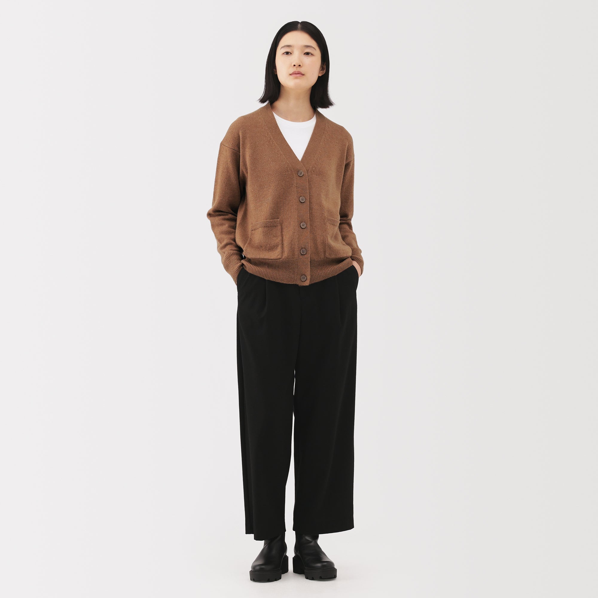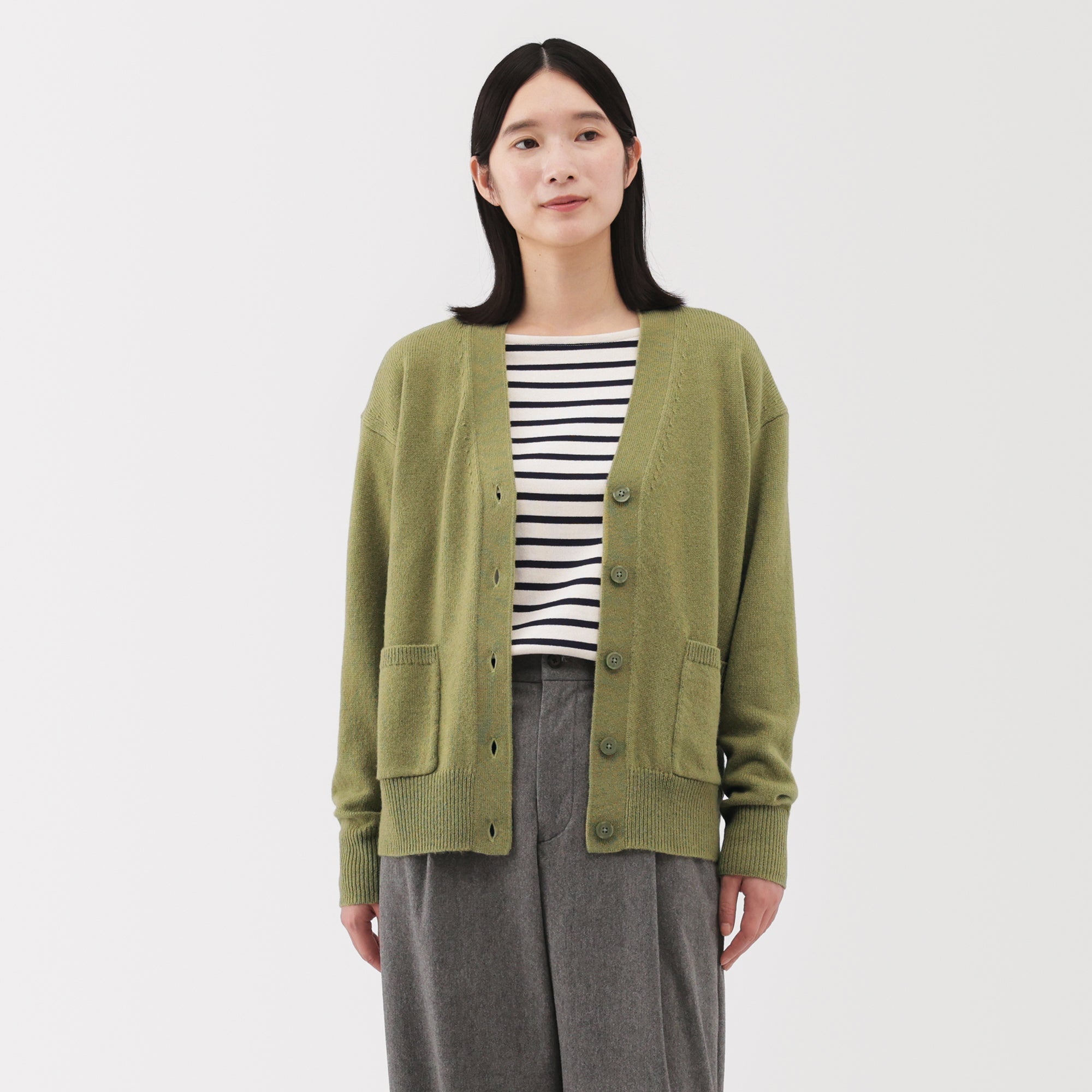 This women’s V-neck cardigan is soft and cozy. made from fine. durable mid-gauge wool thread that is smooth on the skin. The wool material ensures warmth for versatile styling on its own or as a layering piece on chilly days. It also features a shrink-proof finish. making it easily washable at home.