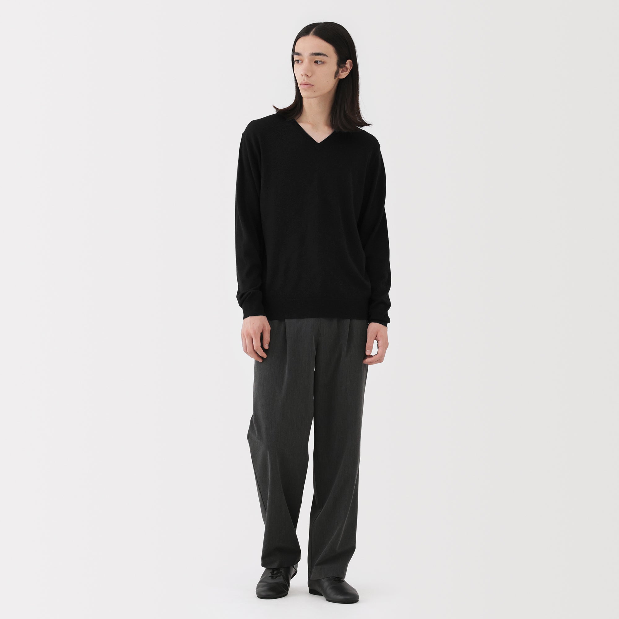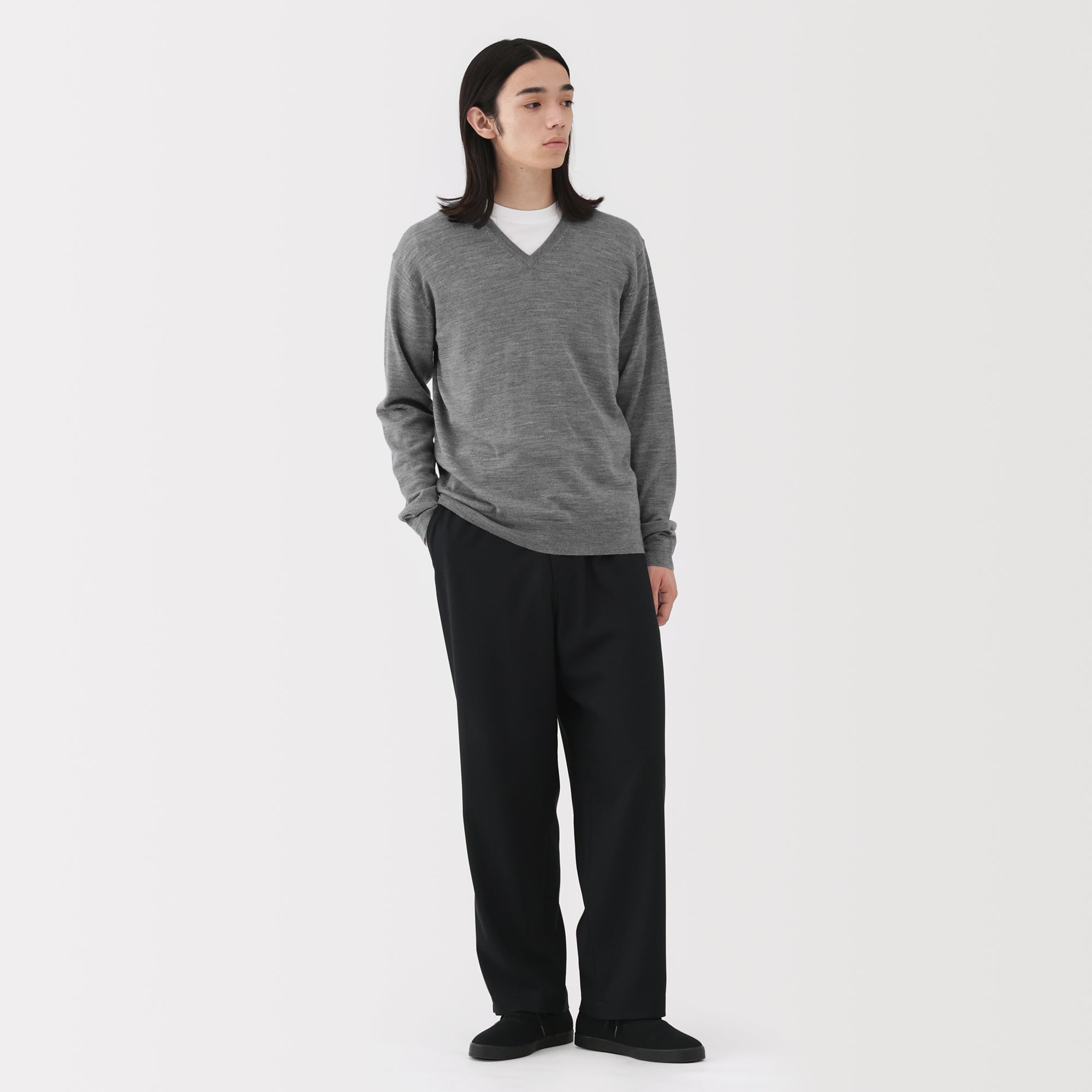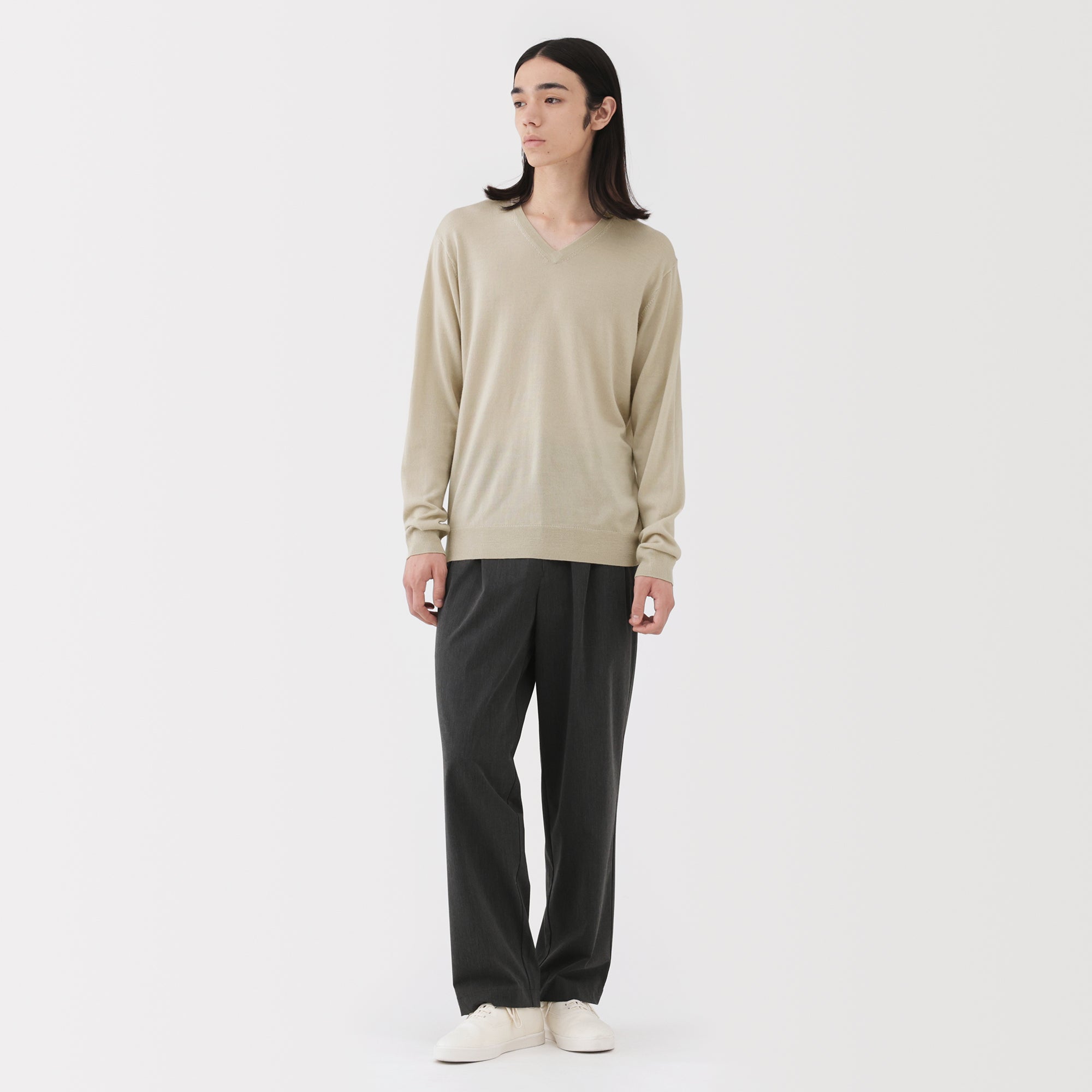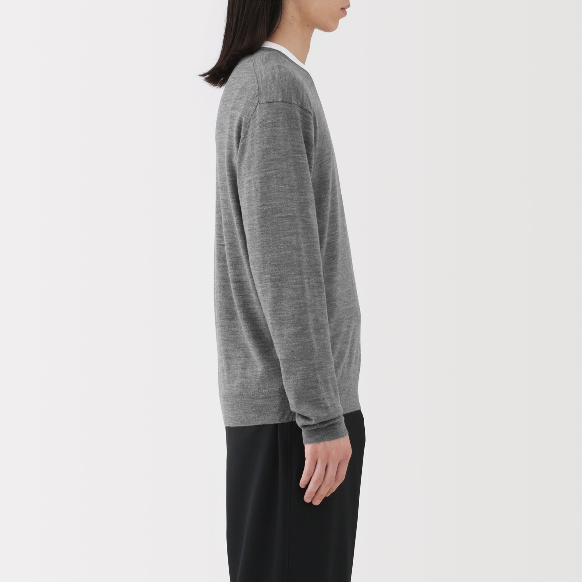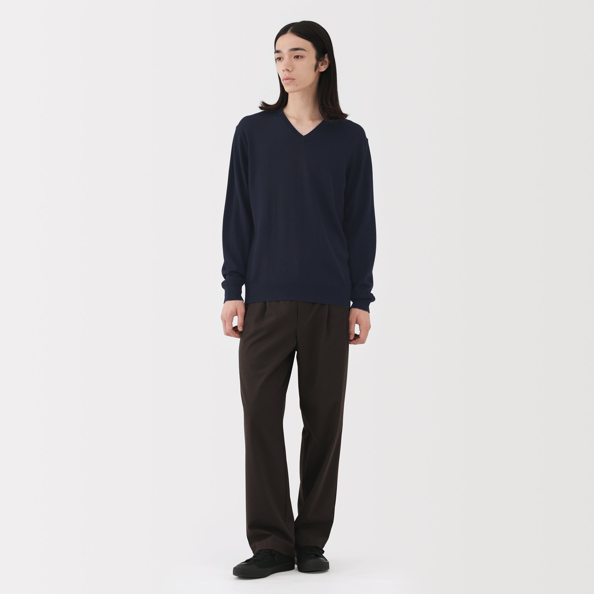 This men’s V-neck sweater is soft and cozy. made from fine. durable high-gauge wool thread that is smooth on the skin. The thin wool material ensures warmth for versatile styling on its own or as a layering piece on chilly days. It also features a shrink-proof finish. making it easily washable at home.