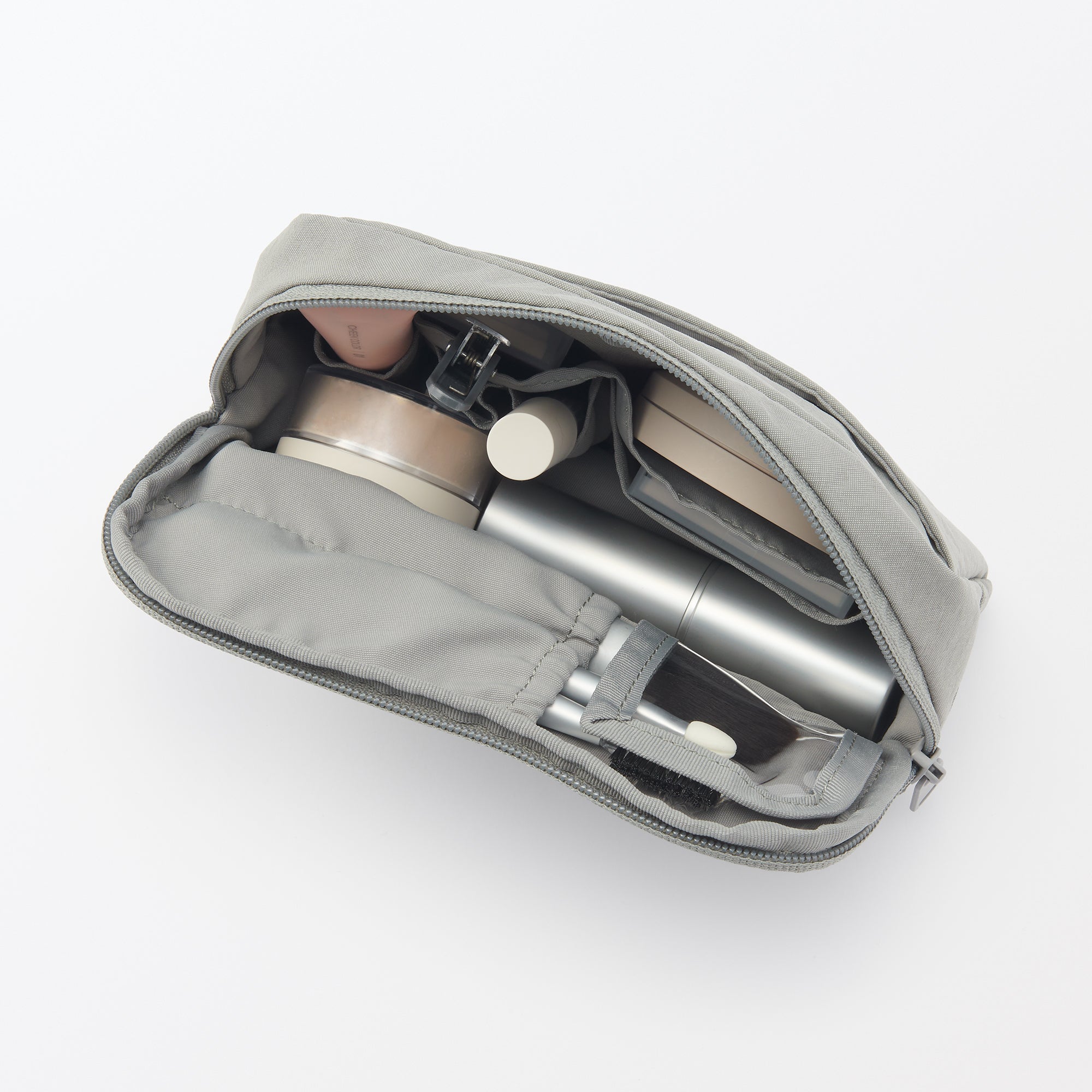 A large compact zippered travel pouch made from sturdy nylon fabric with a distinctive wrinkled texture. The zipper is designed to open wide. allowing you to see all of its contents quickly and clearly. The interior features multiple pockets for organizing cosmetics and other small items. with a transparent cover to prevent powder on makeup brushes from scattering inside the pouch. There is an external pocket for extra storage.